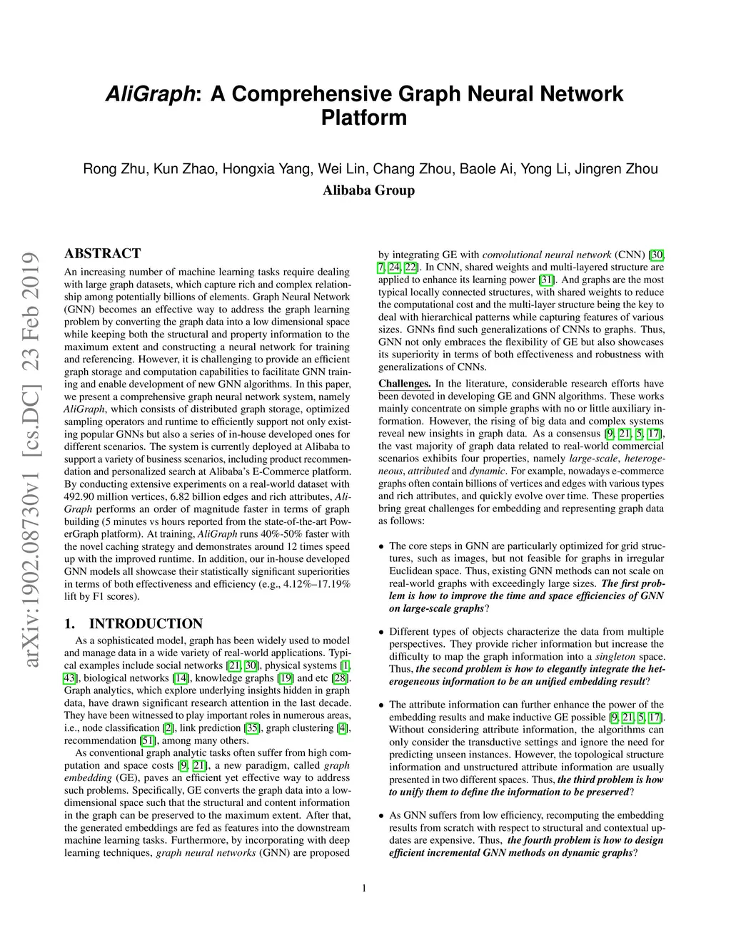 An increasing number of machine learning tasks require dealing with large graph datasets, which capture rich and complex relationship among potentially billions of elements. Graph Neural Network (GNN) becomes an effective way to address the graph learning problem by converting the graph data into a low dimensional space while keeping both the structural and property information to the maximum extent and constructing a neural network for training and referencing. However, it is challenging to provide an efficient graph storage and computation capabilities to facilitate GNN training and enable development of new GNN algorithms. In this paper, we present a comprehensive graph neural network system, namely AliGraph, which consists of distributed graph storage, optimized sampling operators and runtime to efficiently support not only existing popular GNNs but also a series of in-house developed ones for different scenarios. The system is currently deployed at Alibaba to support a variety of business scenarios, including product recommendation and personalized search at Alibaba's E-Commerce platform. By conducting extensive experiments on a real-world dataset with 492.90 million vertices, 6.82 billion edges and rich attributes, AliGraph performs an order of magnitude faster in terms of graph building (5 minutes vs hours reported from the state-of-the-art PowerGraph platform). At training, AliGraph runs 40%-50% faster with the novel caching strategy and demonstrates around 12 times speed up with the improved runtime. In addition, our in-house developed GNN models all showcase their statistically significant superiorities in terms of both effectiveness and efficiency (e.g., 4.12%-17.19% lift by F1 scores).