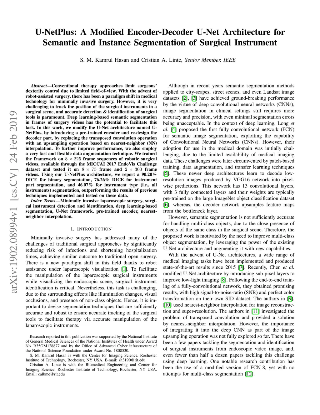 Conventional therapy approaches limit surgeons' dexterity control due to limited field-of-view. With the advent of robot-assisted surgery, there has been a paradigm shift in medical technology for minimally invasive surgery. However, it is very challenging to track the position of the surgical instruments in a surgical scene, and accurate detection & identification of surgical tools is paramount. Deep learning-based semantic segmentation in frames of surgery videos has the potential to facilitate this task. In this work, we modify the U-Net architecture named U-NetPlus, by introducing a pre-trained encoder and re-design the decoder part, by replacing the transposed convolution operation with an upsampling operation based on nearest-neighbor (NN) interpolation. To further improve performance, we also employ a very fast and flexible data augmentation technique. We trained the framework on 8 x 225 frame sequences of robotic surgical videos, available through the MICCAI 2017 EndoVis Challenge dataset and tested it on 8 x 75 frame and 2 x 300 frame videos. Using our U-NetPlus architecture, we report a 90.20% DICE for binary segmentation, 76.26% DICE for instrument part segmentation, and 46.07% for instrument type (i.e., all instruments) segmentation, outperforming the results of previous techniques implemented and tested on these data.
