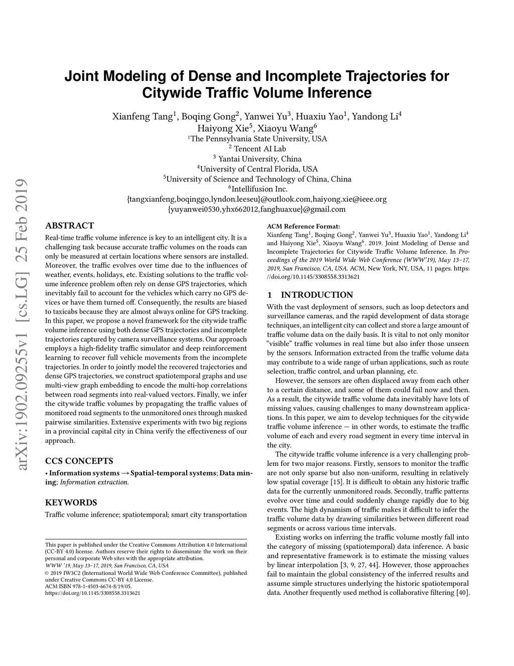 Real-time traffic volume inference is key to an intelligent city. It is a challenging task because accurate traffic volumes on the roads can only be measured at certain locations where sensors are installed. Moreover, the traffic evolves over time due to the influences of weather, events, holidays, etc. Existing solutions to the traffic volume inference problem often rely on dense GPS trajectories, which inevitably fail to account for the vehicles which carry no GPS devices or have them turned off. Consequently, the results are biased to taxicabs because they are almost always online for GPS tracking. In this paper, we propose a novel framework for the citywide traffic volume inference using both dense GPS trajectories and incomplete trajectories captured by camera surveillance systems. Our approach employs a high-fidelity traffic simulator and deep reinforcement learning to recover full vehicle movements from the incomplete trajectories. In order to jointly model the recovered trajectories and dense GPS trajectories, we construct spatiotemporal graphs and use multi-view graph embedding to encode the multi-hop correlations between road segments into real-valued vectors. Finally, we infer the citywide traffic volumes by propagating the traffic values of monitored road segments to the unmonitored ones through masked pairwise similarities. Extensive experiments with two big regions in a provincial capital city in China verify the effectiveness of our approach.