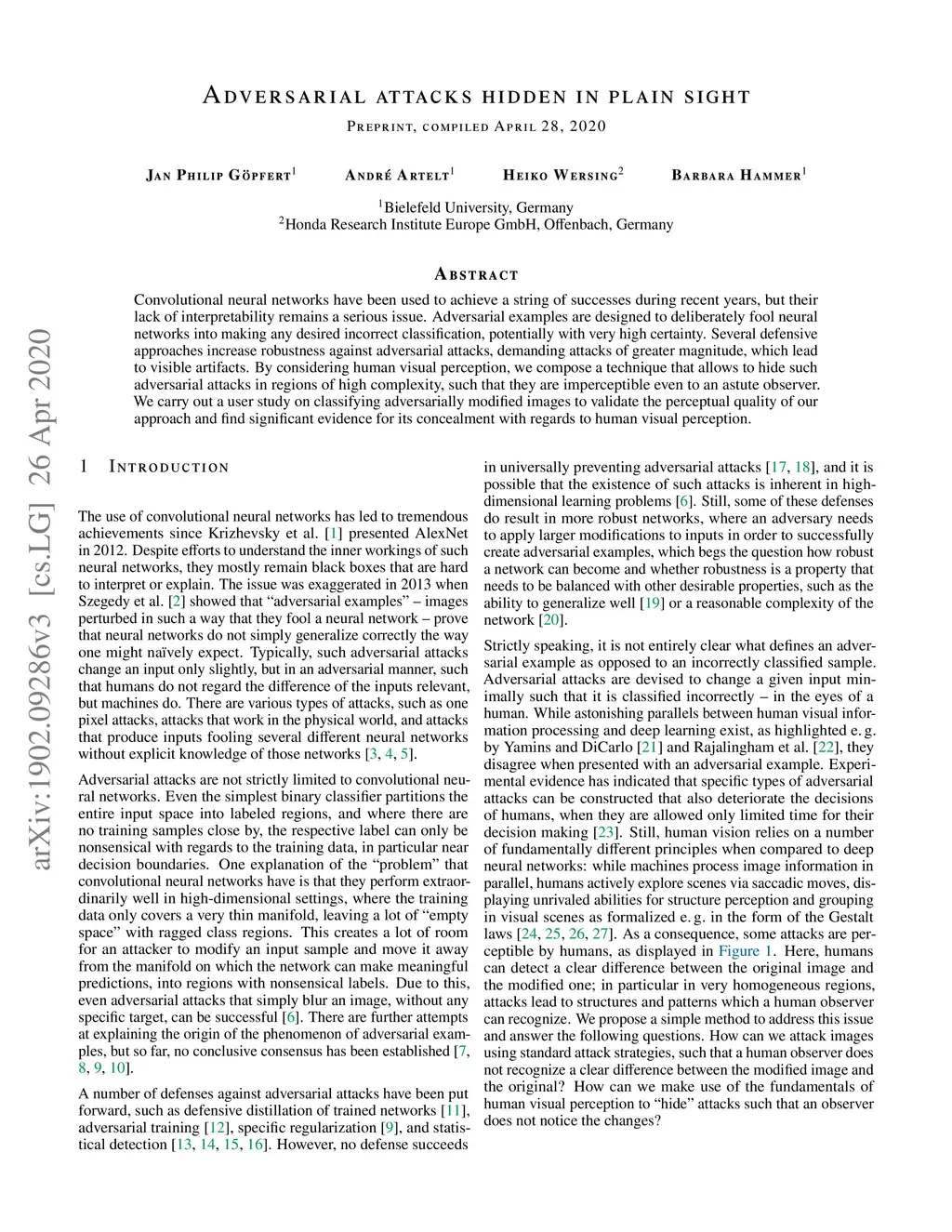 Convolutional neural networks have been used to achieve a string of successes during recent years, but their lack of interpretability remains a serious issue. Adversarial examples are designed to deliberately fool neural networks into making any desired incorrect classification, potentially with very high certainty. Several defensive approaches increase robustness against adversarial attacks, demanding attacks of greater magnitude, which lead to visible artifacts. By considering human visual perception, we compose a technique that allows to hide such adversarial attacks in regions of high complexity, such that they are imperceptible even to an astute observer. We carry out a user study on classifying adversarially modified images to validate the perceptual quality of our approach and find significant evidence for its concealment with regards to human visual perception.