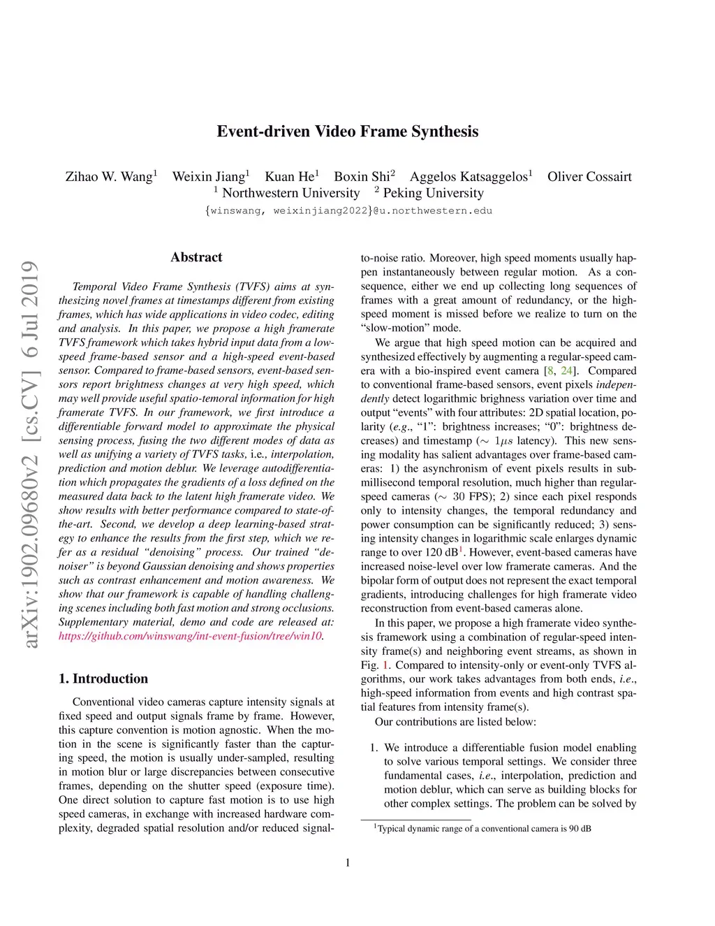 Temporal Video Frame Synthesis (TVFS) aims at synthesizing novel frames at timestamps different from existing frames, which has wide applications in video codec, editing and analysis. In this paper, we propose a high framerate TVFS framework which takes hybrid input data from a low-speed frame-based sensor and a high-speed event-based sensor. Compared to frame-based sensors, event-based sensors report brightness changes at very high speed, which may well provide useful spatio-temoral information for high framerate TVFS. In our framework, we first introduce a differentiable forward model to approximate the physical sensing process, fusing the two different modes of data as well as unifying a variety of TVFS tasks, i.e., interpolation, prediction and motion deblur. We leverage autodifferentiation which propagates the gradients of a loss defined on the measured data back to the latent high framerate video. We show results with better performance compared to state-of-the-art. Second, we develop a deep learning-based strategy to enhance the results from the first step, which we refer as a residual "denoising" process. Our trained "denoiser" is beyond Gaussian denoising and shows properties such as contrast enhancement and motion awareness. We show that our framework is capable of handling challenging scenes including both fast motion and strong occlusions.