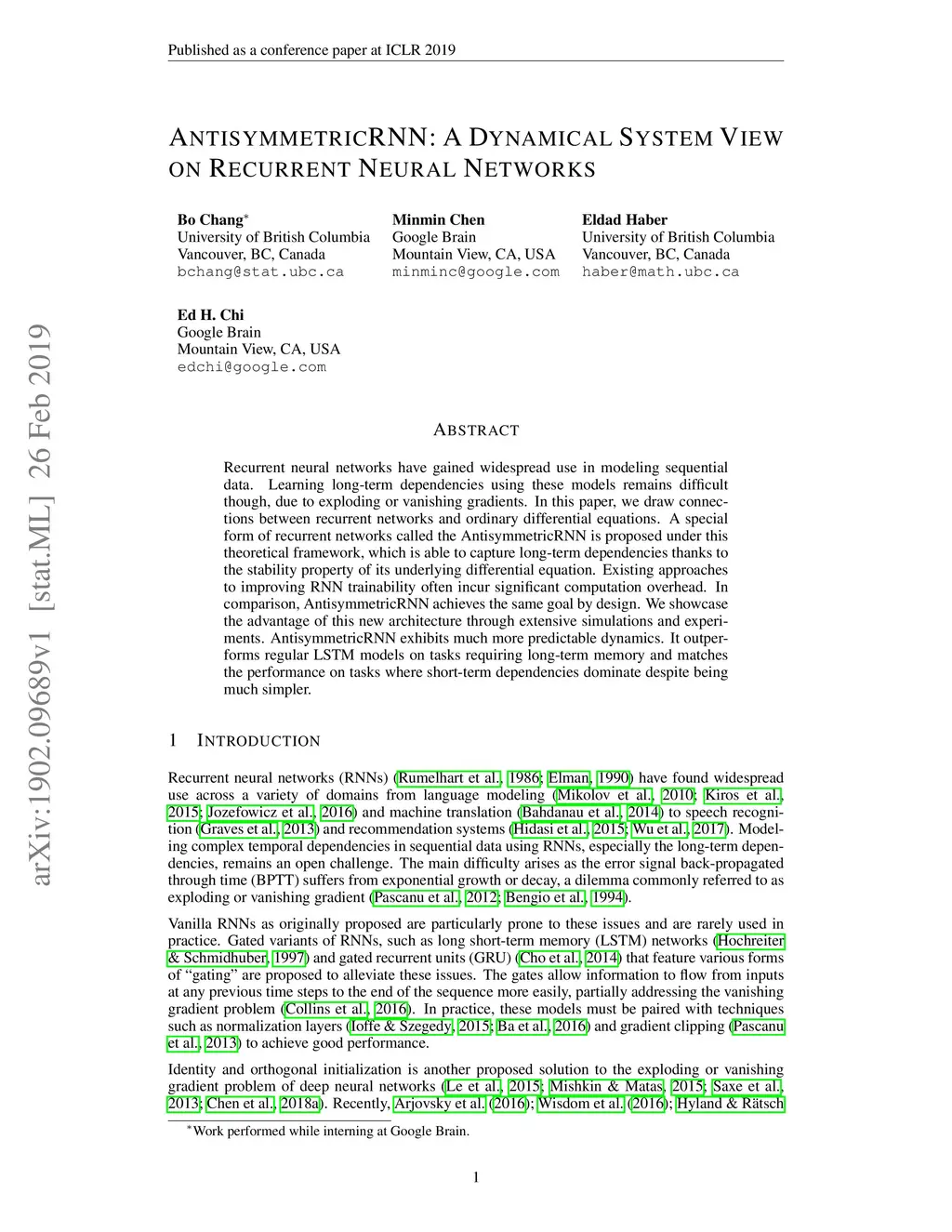 Recurrent neural networks have gained widespread use in modeling sequential data. Learning long-term dependencies using these models remains difficult though, due to exploding or vanishing gradients. In this paper, we draw connections between recurrent networks and ordinary differential equations. A special form of recurrent networks called the AntisymmetricRNN is proposed under this theoretical framework, which is able to capture long-term dependencies thanks to the stability property of its underlying differential equation. Existing approaches to improving RNN trainability often incur significant computation overhead. In comparison, AntisymmetricRNN achieves the same goal by design. We showcase the advantage of this new architecture through extensive simulations and experiments. AntisymmetricRNN exhibits much more predictable dynamics. It outperforms regular LSTM models on tasks requiring long-term memory and matches the performance on tasks where short-term dependencies dominate despite being much simpler.