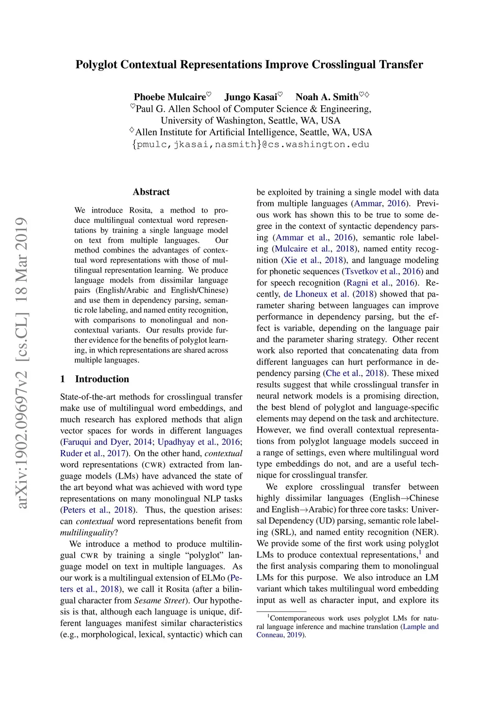 We introduce Rosita, a method to produce multilingual contextual word representations by training a single language model on text from multiple languages. Our method combines the advantages of contextual word representations with those of multilingual representation learning. We produce language models from dissimilar language pairs (English/Arabic and English/Chinese) and use them in dependency parsing, semantic role labeling, and named entity recognition, with comparisons to monolingual and non-contextual variants. Our results provide further evidence for the benefits of polyglot learning, in which representations are shared across multiple languages.