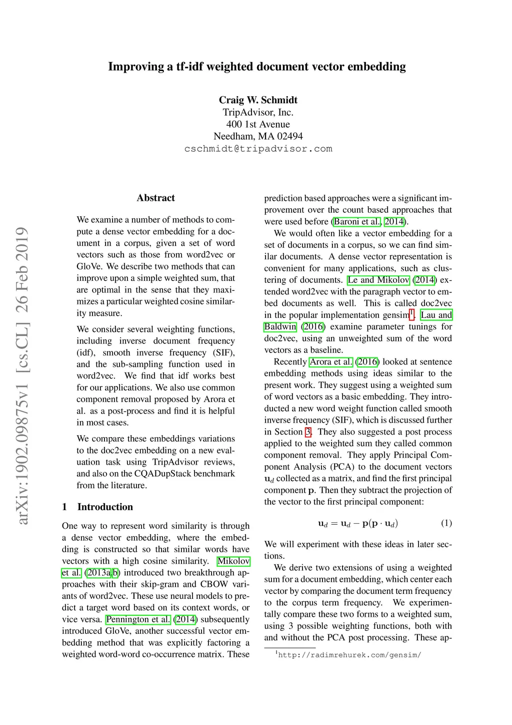 We examine a number of methods to compute a dense vector embedding for a document in a corpus, given a set of word vectors such as those from word2vec or GloVe. We describe two methods that can improve upon a simple weighted sum, that are optimal in the sense that they maximizes a particular weighted cosine similarity measure. We consider several weighting functions, including inverse document frequency (idf), smooth inverse frequency (SIF), and the sub-sampling function used in word2vec. We find that idf works best for our applications. We also use common component removal proposed by Arora et al. as a post-process and find it is helpful in most cases. We compare these embeddings variations to the doc2vec embedding on a new evaluation task using TripAdvisor reviews, and also on the CQADupStack benchmark from the literature.