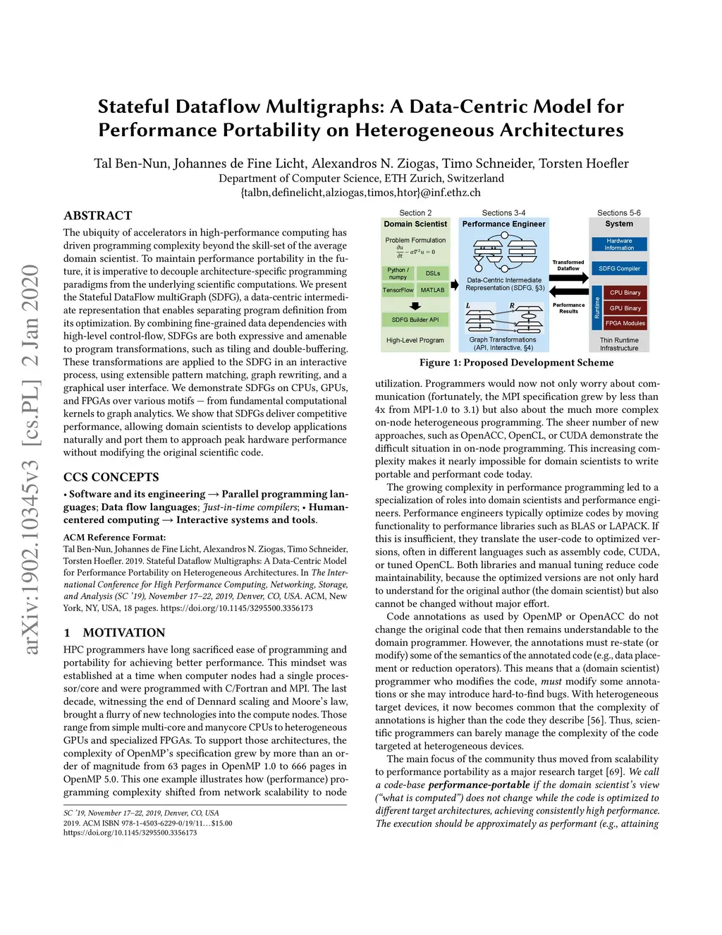 The ubiquity of accelerators in high-performance computing has driven programming complexity beyond the skill-set of the average domain scientist. To maintain performance portability in the future, it is imperative to decouple architecture-specific programming paradigms from the underlying scientific computations. We present the Stateful DataFlow multiGraph (SDFG), a data-centric intermediate representation that enables separating program definition from its optimization. By combining fine-grained data dependencies with high-level control-flow, SDFGs are both expressive and amenable to program transformations, such as tiling and double-buffering. These transformations are applied to the SDFG in an interactive process, using extensible pattern matching, graph rewriting, and a graphical user interface. We demonstrate SDFGs on CPUs, GPUs, and FPGAs over various motifs --- from fundamental computational kernels to graph analytics. We show that SDFGs deliver competitive performance, allowing domain scientists to develop applications naturally and port them to approach peak hardware performance without modifying the original scientific code.