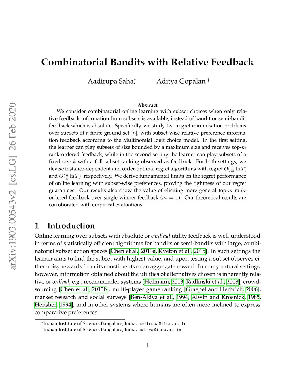 We consider combinatorial online learning with subset choices when only relative feedback information from subsets is available, instead of bandit or semi-bandit feedback which is absolute. Specifically, we study two regret minimisation problems over subsets of a finite ground set , with subset-wise relative preference information feedback according to the Multinomial logit choice model. In the first setting, the learner can play subsets of size bounded by a maximum size and receives top- rank-ordered feedback, while in the second setting the learner can play subsets of a fixed size with a full subset ranking observed as feedback. For both settings, we devise instance-dependent and order-optimal regret algorithms with regret and , respectively. We derive fundamental limits on the regret performance of online learning with subset-wise preferences, proving the tightness of our regret guarantees. Our results also show the value of eliciting more general top- rank-ordered feedback over single winner feedback (). Our theoretical results are corroborated with empirical evaluations.
