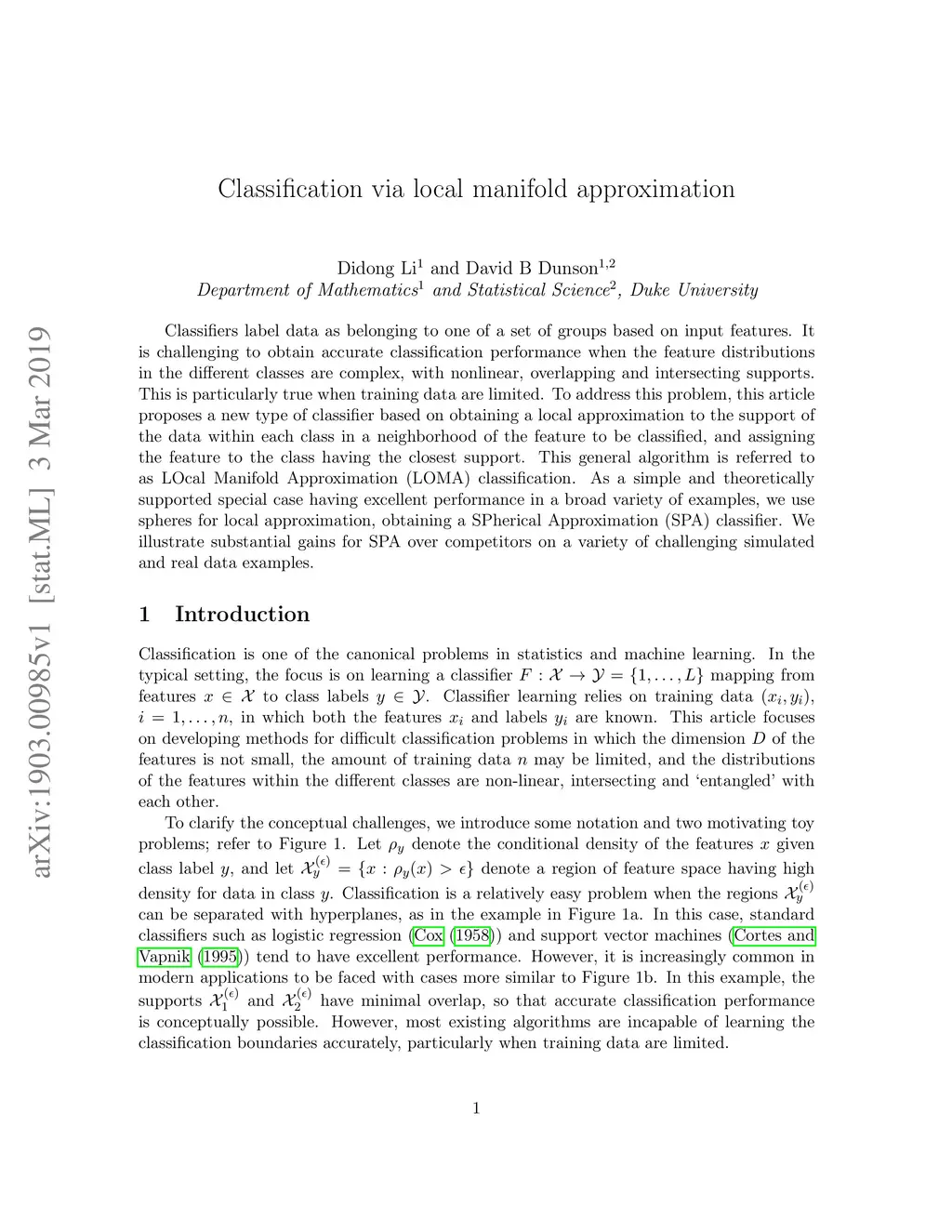 Classifiers label data as belonging to one of a set of groups based on input features. It is challenging to obtain accurate classification performance when the feature distributions in the different classes are complex, with nonlinear, overlapping and intersecting supports. This is particularly true when training data are limited. To address this problem, this article proposes a new type of classifier based on obtaining a local approximation to the support of the data within each class in a neighborhood of the feature to be classified, and assigning the feature to the class having the closest support. This general algorithm is referred to as LOcal Manifold Approximation (LOMA) classification. As a simple and theoretically supported special case having excellent performance in a broad variety of examples, we use spheres for local approximation, obtaining a SPherical Approximation (SPA) classifier. We illustrate substantial gains for SPA over competitors on a variety of challenging simulated and real data examples.