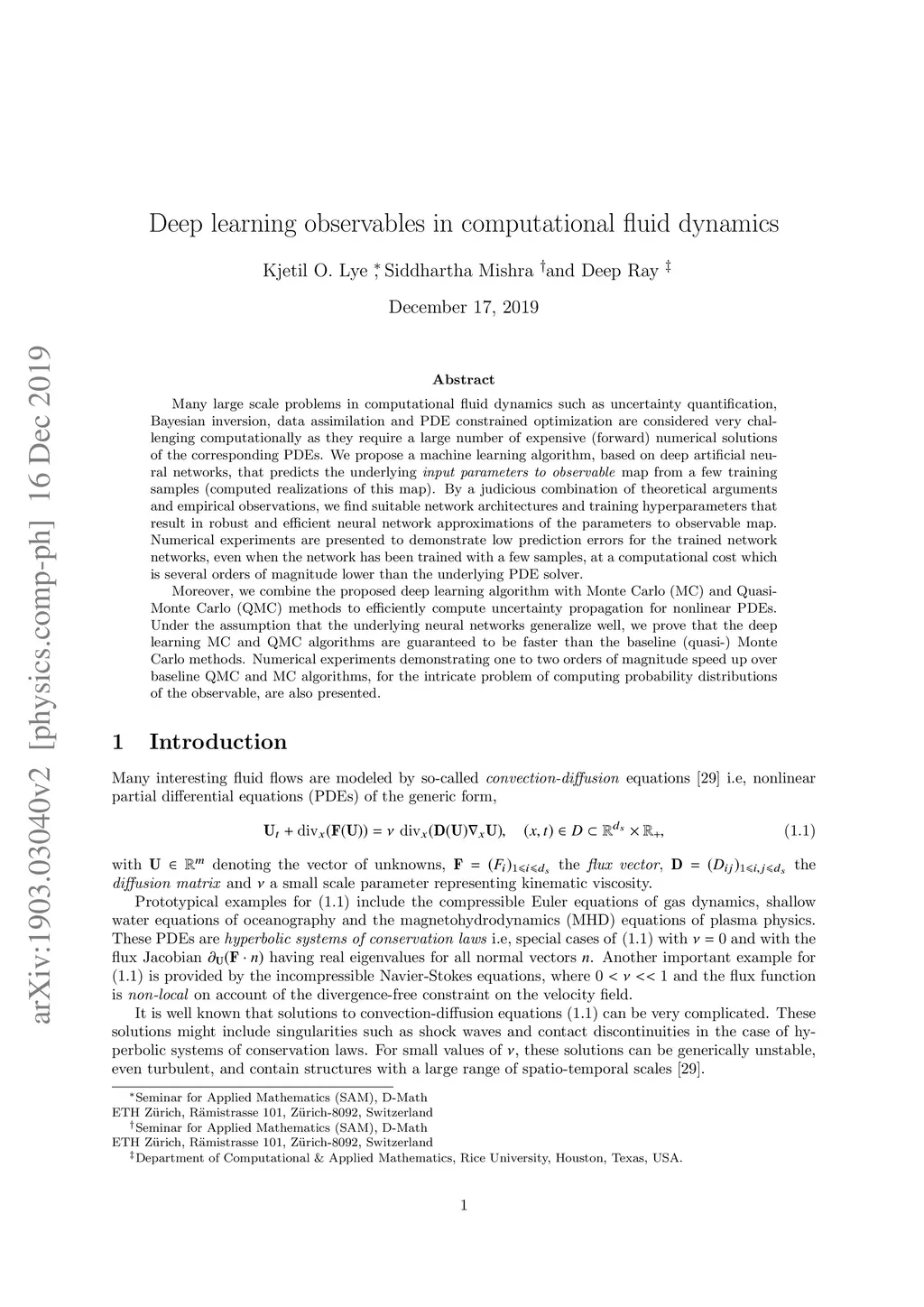 Many large scale problems in computational fluid dynamics such as uncertainty quantification, Bayesian inversion, data assimilation and PDE constrained optimization are considered very challenging computationally as they require a large number of expensive (forward) numerical solutions of the corresponding PDEs. We propose a machine learning algorithm, based on deep artificial neural networks, that predicts the underlying \emph{input parameters to observable} map from a few training samples (computed realizations of this map). By a judicious combination of theoretical arguments and empirical observations, we find suitable network architectures and training hyperparameters that result in robust and efficient neural network approximations of the parameters to observable map. Numerical experiments are presented to demonstrate low prediction errors for the trained network networks, even when the network has been trained with a few samples, at a computational cost which is several orders of magnitude lower than the underlying PDE solver. Moreover, we combine the proposed deep learning algorithm with Monte Carlo (MC) and Quasi-Monte Carlo (QMC) methods to efficiently compute uncertainty propagation for nonlinear PDEs. Under the assumption that the underlying neural networks generalize well, we prove that the deep learning MC and QMC algorithms are guaranteed to be faster than the baseline (quasi-) Monte Carlo methods. Numerical experiments demonstrating one to two orders of magnitude speed up over baseline QMC and MC algorithms, for the intricate problem of computing probability distributions of the observable, are also presented.