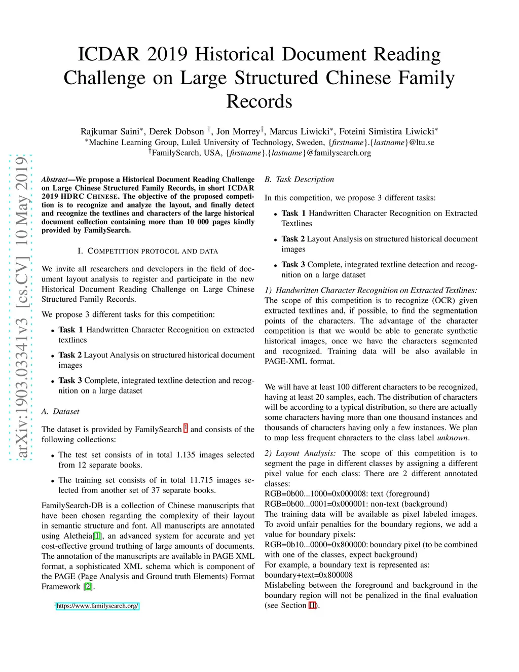ICDAR 2019 Historical Document Reading Challenge on Large Structured Chinese Family Records