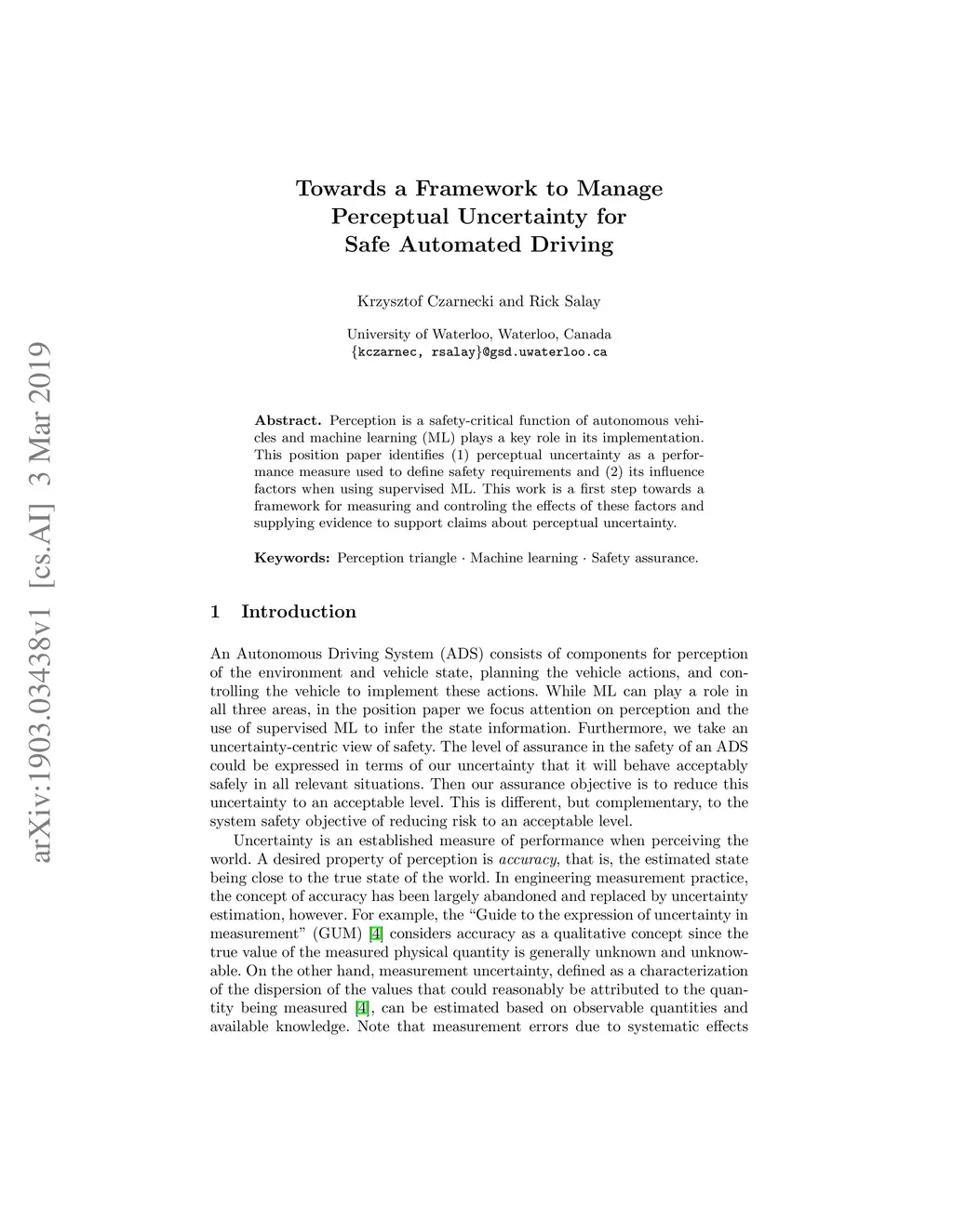 Perception is a safety-critical function of autonomous vehicles and machine learning (ML) plays a key role in its implementation. This position paper identifies (1) perceptual uncertainty as a performance measure used to define safety requirements and (2) its influence factors when using supervised ML. This work is a first step towards a framework for measuring and controling the effects of these factors and supplying evidence to support claims about perceptual uncertainty.