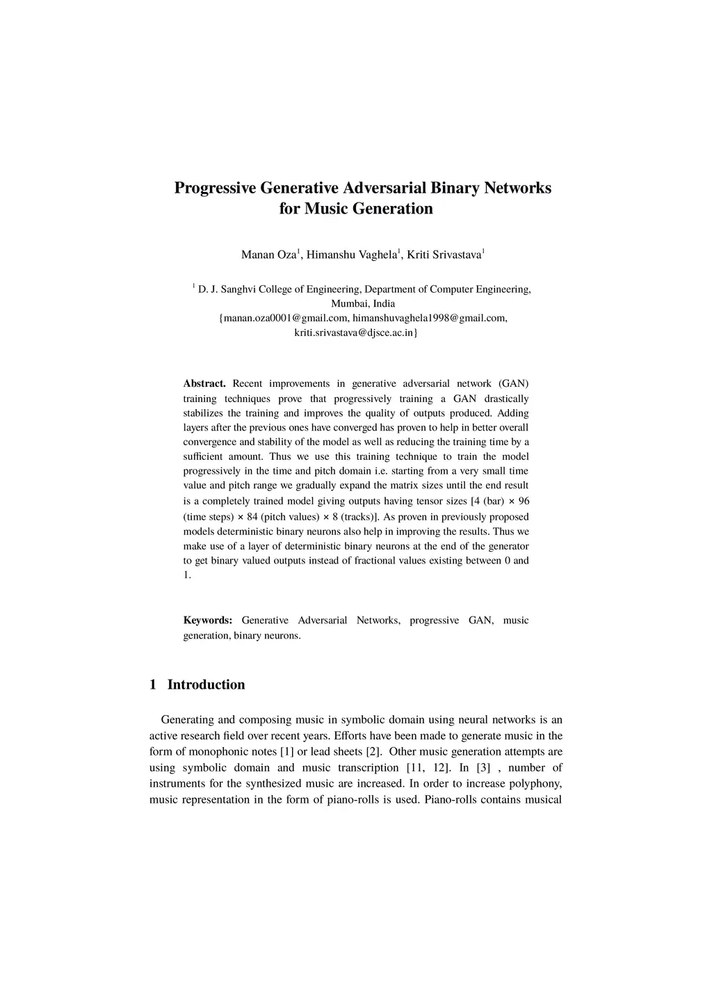 Recent improvements in generative adversarial network (GAN) training techniques prove that progressively training a GAN drastically stabilizes the training and improves the quality of outputs produced. Adding layers after the previous ones have converged has proven to help in better overall convergence and stability of the model as well as reducing the training time by a sufficient amount. Thus we use this training technique to train the model progressively in the time and pitch domain i.e. starting from a very small time value and pitch range we gradually expand the matrix sizes until the end result is a completely trained model giving outputs having tensor sizes [4 (bar) x 96 (time steps) x 84 (pitch values) x 8 (tracks)]. As proven in previously proposed models deterministic binary neurons also help in improving the results. Thus we make use of a layer of deterministic binary neurons at the end of the generator to get binary valued outputs instead of fractional values existing between 0 and 1.