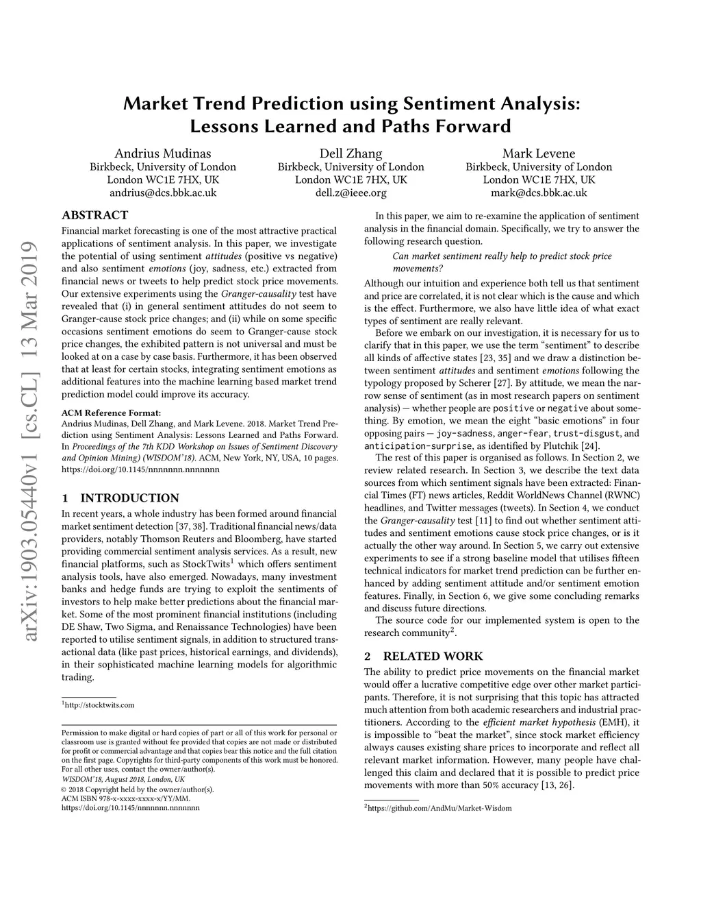 Financial market forecasting is one of the most attractive practical applications of sentiment analysis. In this paper, we investigate the potential of using sentiment \emph{attitudes} (positive vs negative) and also sentiment \emph{emotions} (joy, sadness, etc.) extracted from financial news or tweets to help predict stock price movements. Our extensive experiments using the \emph{Granger-causality} test have revealed that (i) in general sentiment attitudes do not seem to Granger-cause stock price changes; and (ii) while on some specific occasions sentiment emotions do seem to Granger-cause stock price changes, the exhibited pattern is not universal and must be looked at on a case by case basis. Furthermore, it has been observed that at least for certain stocks, integrating sentiment emotions as additional features into the machine learning based market trend prediction model could improve its accuracy.