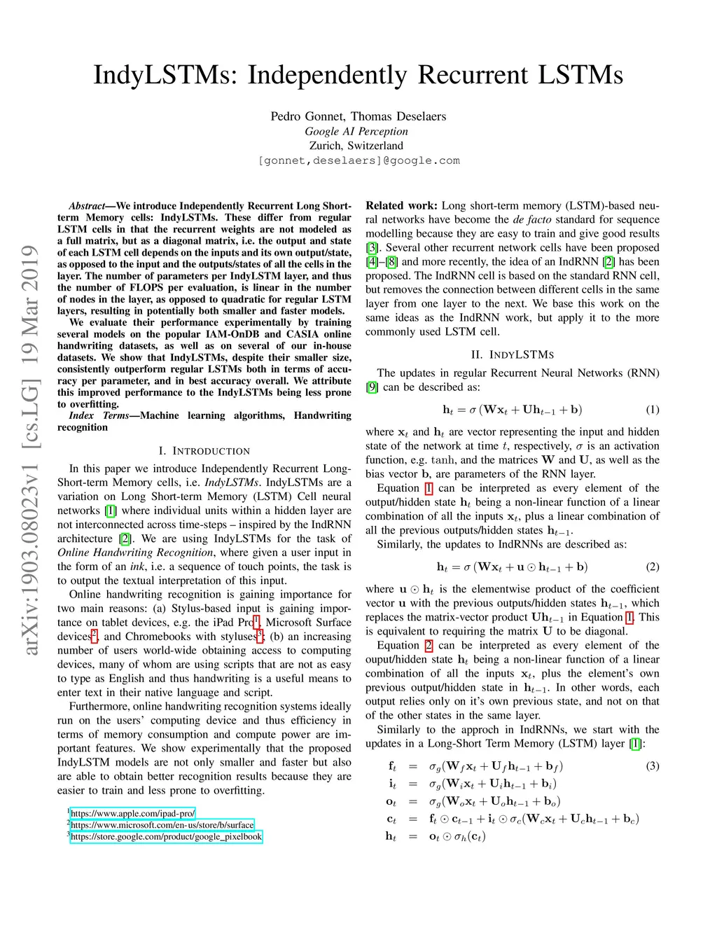 We introduce Independently Recurrent Long Short-term Memory cells: IndyLSTMs. These differ from regular LSTM cells in that the recurrent weights are not modeled as a full matrix, but as a diagonal matrix, i.e.\ the output and state of each LSTM cell depends on the inputs and its own output/state, as opposed to the input and the outputs/states of all the cells in the layer. The number of parameters per IndyLSTM layer, and thus the number of FLOPS per evaluation, is linear in the number of nodes in the layer, as opposed to quadratic for regular LSTM layers, resulting in potentially both smaller and faster models. We evaluate their performance experimentally by training several models on the popular \iamondb and CASIA online handwriting datasets, as well as on several of our in-house datasets. We show that IndyLSTMs, despite their smaller size, consistently outperform regular LSTMs both in terms of accuracy per parameter, and in best accuracy overall. We attribute this improved performance to the IndyLSTMs being less prone to overfitting.