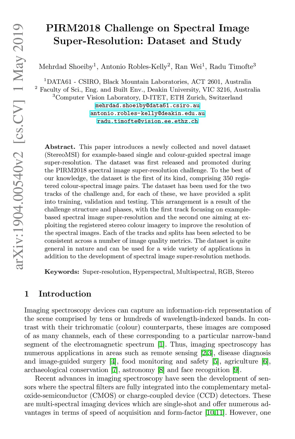 This paper introduces a newly collected and novel dataset (StereoMSI) for example-based single and colour-guided spectral image super-resolution. The dataset was first released and promoted during the PIRM2018 spectral image super-resolution challenge. To the best of our knowledge, the dataset is the first of its kind, comprising 350 registered colour-spectral image pairs. The dataset has been used for the two tracks of the challenge and, for each of these, we have provided a split into training, validation and testing. This arrangement is a result of the challenge structure and phases, with the first track focusing on example-based spectral image super-resolution and the second one aiming at exploiting the registered stereo colour imagery to improve the resolution of the spectral images. Each of the tracks and splits has been selected to be consistent across a number of image quality metrics. The dataset is quite general in nature and can be used for a wide variety of applications in addition to the development of spectral image super-resolution methods.
