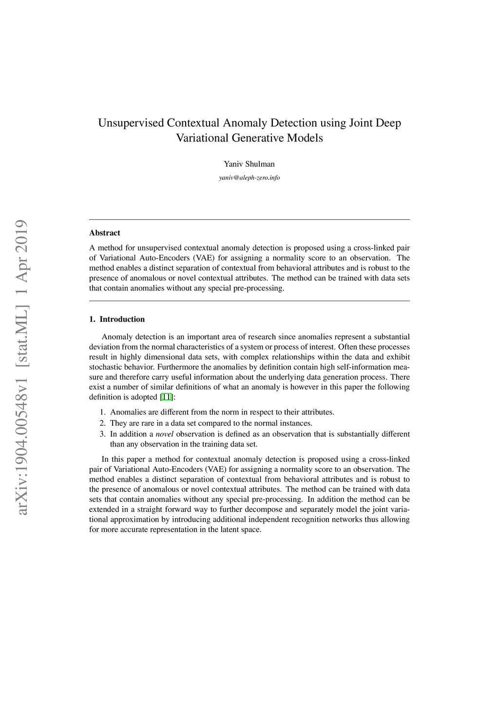 A method for unsupervised contextual anomaly detection is proposed using a cross-linked pair of Variational Auto-Encoders for assigning a normality score to an observation. The method enables a distinct separation of contextual from behavioral attributes and is robust to the presence of anomalous or novel contextual attributes. The method can be trained with data sets that contain anomalies without any special pre-processing.