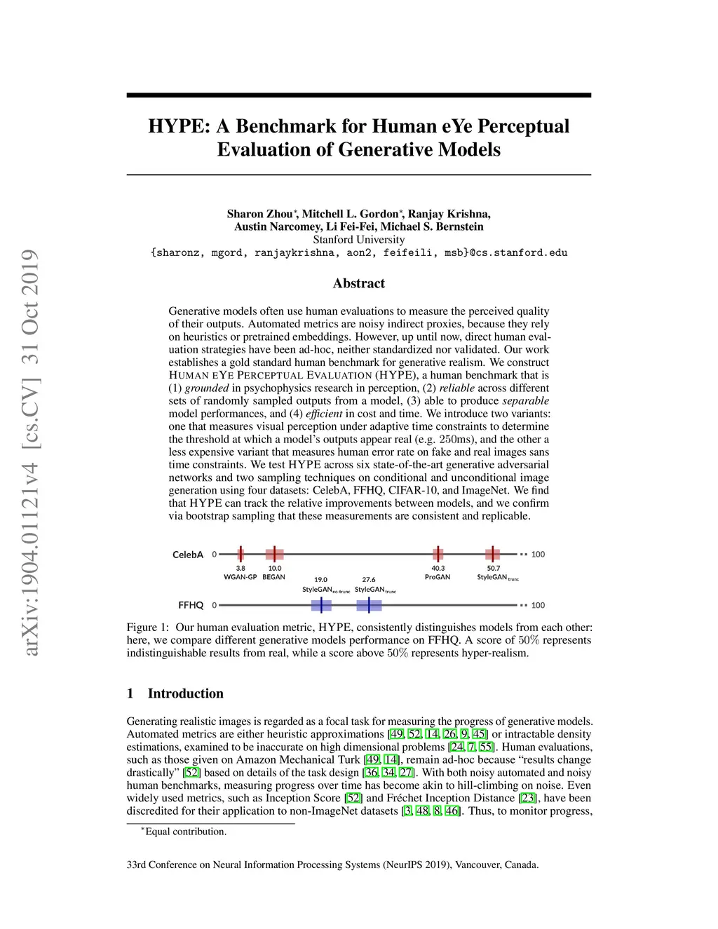 Generative models often use human evaluations to determine and justify progress. Unfortunately, existing human evaluation methods are ad-hoc: there is currently no standardized, validated evaluation that: (1) measures perceptual fidelity, (2) is reliable, (3) separates models into clear rank order, and (4) ensures high-quality measurement without intractable cost. In response, we construct Human-eYe Perceptual Evaluation (HYPE), a human metric that is (1) grounded in psychophysics research in perception, (2) reliable across different sets of randomly sampled outputs from a model, (3) results in separable model performances, and (4) efficient in cost and time. We introduce two methods. The first, HYPE-Time, measures visual perception under adaptive time constraints to determine the minimum length of time (e.g., 250ms) that model output such as a generated face needs to be visible for people to distinguish it as real or fake. The second, HYPE-Infinity, measures human error rate on fake and real images with no time constraints, maintaining stability and drastically reducing time and cost. We test HYPE across four state-of-the-art generative adversarial networks (GANs) on unconditional image generation using two datasets, the popular CelebA and the newer higher-resolution FFHQ, and two sampling techniques of model outputs. By simulating HYPE's evaluation multiple times, we demonstrate consistent ranking of different models, identifying StyleGAN with truncation trick sampling (27.6% HYPE-Infinity deception rate, with roughly one quarter of images being misclassified by humans) as superior to StyleGAN without truncation (19.0%) on FFHQ. See https://hype.stanford.edu for details.