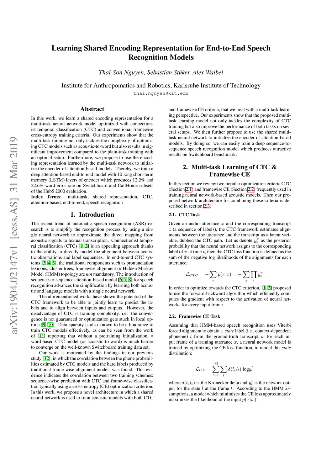 In this work, we learn a shared encoding representation for a multi-task neural network model optimized with connectionist temporal classification (CTC) and conventional framewise cross-entropy training criteria. Our experiments show that the multi-task training not only tackles the complexity of optimizing CTC models such as acoustic-to-word but also results in significant improvement compared to the plain-task training with an optimal setup. Furthermore, we propose to use the encoding representation learned by the multi-task network to initialize the encoder of attention-based models. Thereby, we train a deep attention-based end-to-end model with 10 long short-term memory (LSTM) layers of encoder which produces 12.2\% and 22.6\% word-error-rate on Switchboard and CallHome subsets of the Hub5 2000 evaluation.