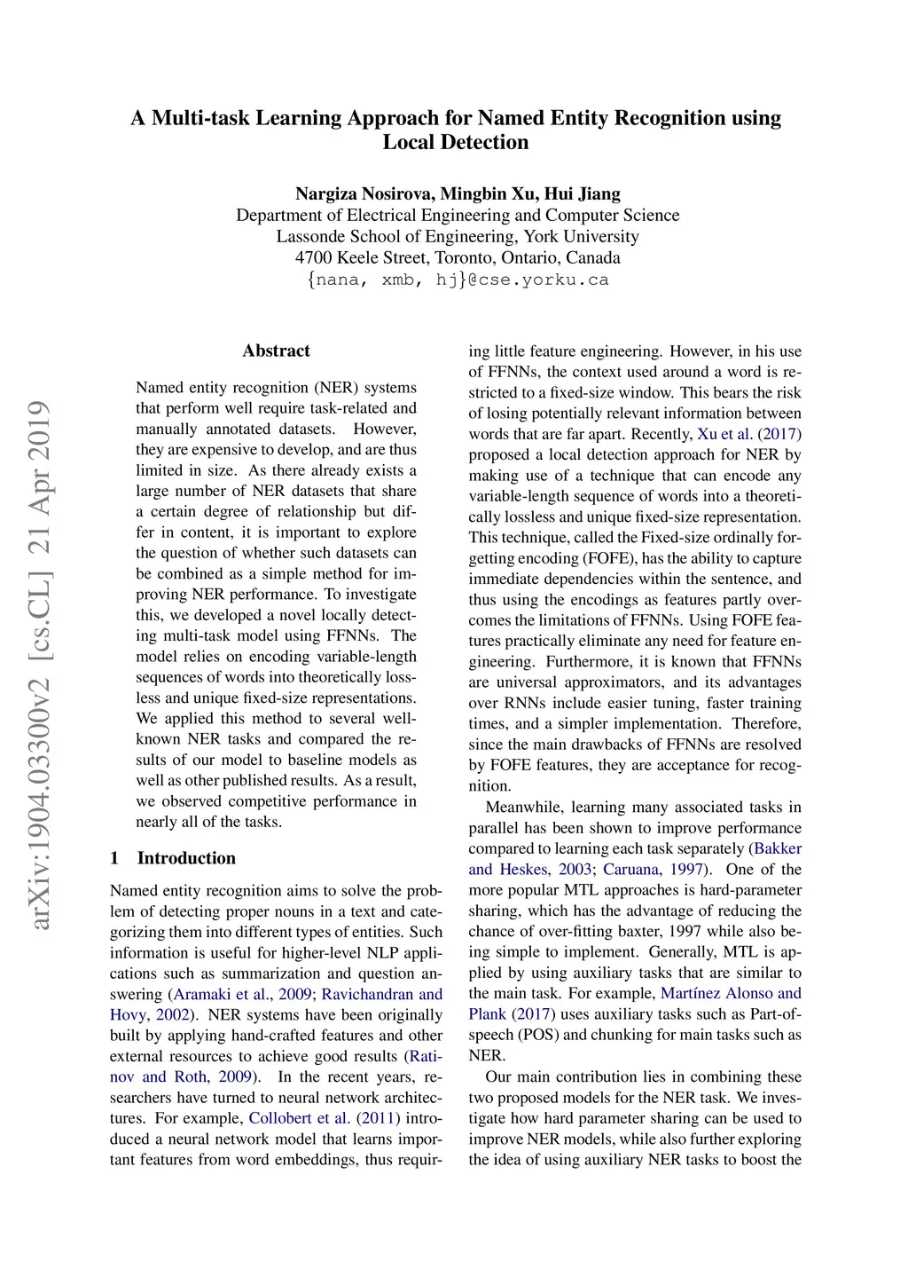 A Multi-task Learning Approach for Named Entity Recognition using Local
