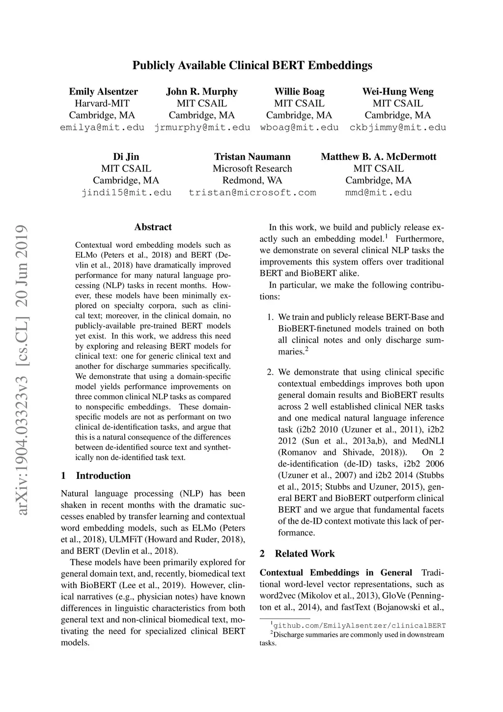 Contextual word embedding models such as ELMo (Peters et al., 2018) and BERT (Devlin et al., 2018) have dramatically improved performance for many natural language processing (NLP) tasks in recent months. However, these models have been minimally explored on specialty corpora, such as clinical text; moreover, in the clinical domain, no publicly-available pre-trained BERT models yet exist. In this work, we address this need by exploring and releasing BERT models for clinical text: one for generic clinical text and another for discharge summaries specifically. We demonstrate that using a domain-specific model yields performance improvements on three common clinical NLP tasks as compared to nonspecific embeddings. These domain-specific models are not as performant on two clinical de-identification tasks, and argue that this is a natural consequence of the differences between de-identified source text and synthetically non de-identified task text.