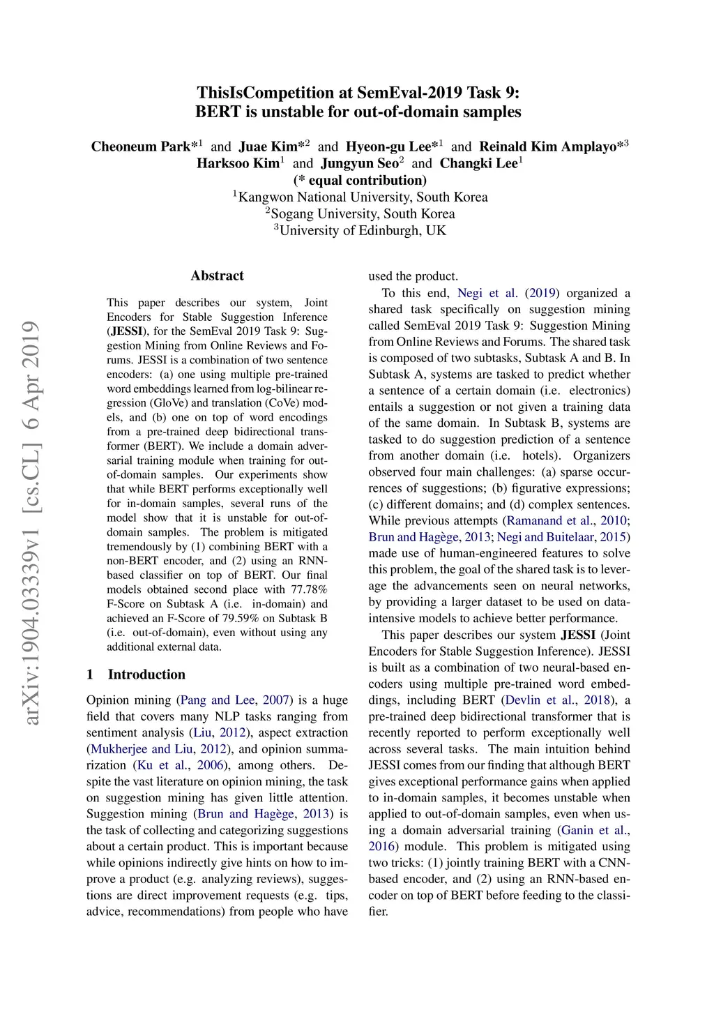 This paper describes our system, Joint Encoders for Stable Suggestion Inference (JESSI), for the SemEval 2019 Task 9: Suggestion Mining from Online Reviews and Forums. JESSI is a combination of two sentence encoders: (a) one using multiple pre-trained word embeddings learned from log-bilinear regression (GloVe) and translation (CoVe) models, and (b) one on top of word encodings from a pre-trained deep bidirectional transformer (BERT). We include a domain adversarial training module when training for out-of-domain samples. Our experiments show that while BERT performs exceptionally well for in-domain samples, several runs of the model show that it is unstable for out-of-domain samples. The problem is mitigated tremendously by (1) combining BERT with a non-BERT encoder, and (2) using an RNN-based classifier on top of BERT. Our final models obtained second place with 77.78\% F-Score on Subtask A (i.e. in-domain) and achieved an F-Score of 79.59\% on Subtask B (i.e. out-of-domain), even without using any additional external data.