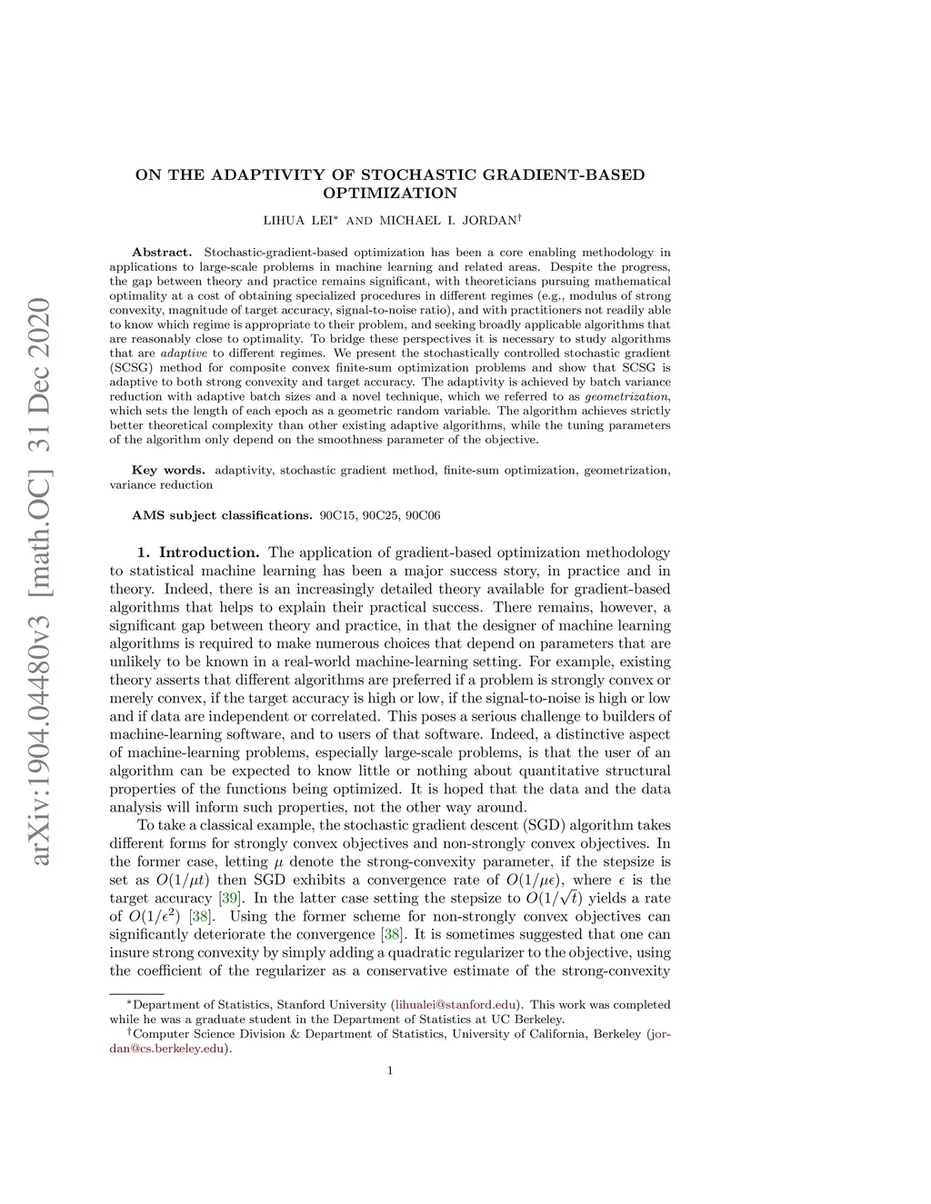 Stochastic-gradient-based optimization has been a core enabling methodology in applications to large-scale problems in machine learning and related areas. Despite the progress, the gap between theory and practice remains significant, with theoreticians pursuing mathematical optimality at a cost of obtaining specialized procedures in different regimes (e.g., modulus of strong convexity, magnitude of target accuracy, signal-to-noise ratio), and with practitioners not readily able to know which regime is appropriate to their problem, and seeking broadly applicable algorithms that are reasonably close to optimality. To bridge these perspectives it is necessary to study algorithms that are adaptive to different regimes. We present the stochastically controlled stochastic gradient (SCSG) method for composite convex finite-sum optimization problems and show that SCSG is adaptive to both strong convexity and target accuracy. The adaptivity is achieved by batch variance reduction with adaptive batch sizes and a novel technique, which we referred to as geometrization, which sets the length of each epoch as a geometric random variable. The algorithm achieves strictly better theoretical complexity than other existing adaptive algorithms, while the tuning parameters of the algorithm only depend on the smoothness parameter of the objective.