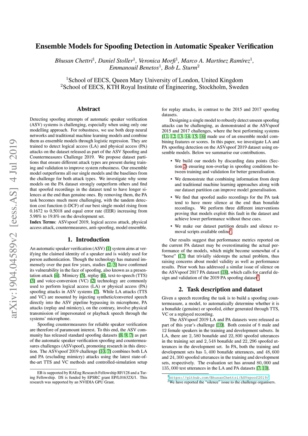 Detecting spoofing attempts of automatic speaker verification (ASV) systems is challenging, especially when using only one modeling approach. For robustness, we use both deep neural networks and traditional machine learning models and combine them as ensemble models through logistic regression. They are trained to detect logical access (LA) and physical access (PA) attacks on the dataset released as part of the ASV Spoofing and Countermeasures Challenge 2019. We propose dataset partitions that ensure different attack types are present during training and validation to improve system robustness. Our ensemble model outperforms all our single models and the baselines from the challenge for both attack types. We investigate why some models on the PA dataset strongly outperform others and find that spoofed recordings in the dataset tend to have longer silences at the end than genuine ones. By removing them, the PA task becomes much more challenging, with the tandem detection cost function (t-DCF) of our best single model rising from 0.1672 to 0.5018 and equal error rate (EER) increasing from 5.98% to 19.8% on the development set.
