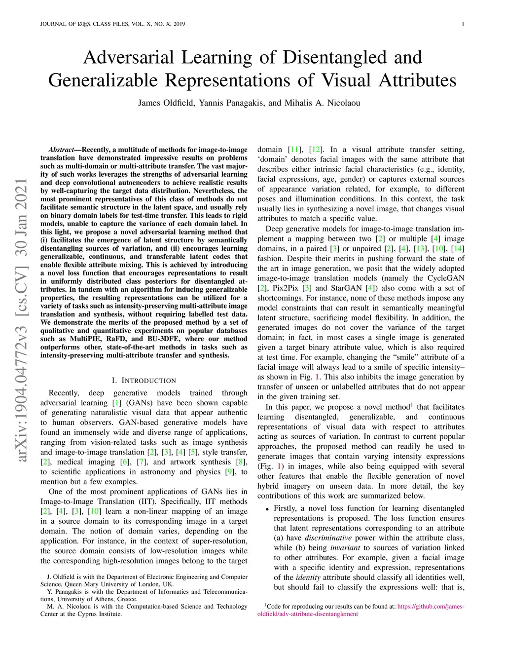 Recently, a multitude of methods for image-to-image translation have demonstrated impressive results on problems such as multi-domain or multi-attribute transfer. The vast majority of such works leverages the strengths of adversarial learning and deep convolutional autoencoders to achieve realistic results by well-capturing the target data distribution. Nevertheless, the most prominent representatives of this class of methods do not facilitate semantic structure in the latent space, and usually rely on binary domain labels for test-time transfer. This leads to rigid models, unable to capture the variance of each domain label. In this light, we propose a novel adversarial learning method that (i) facilitates the emergence of latent structure by semantically disentangling sources of variation, and (ii) encourages learning generalizable, continuous, and transferable latent codes that enable flexible attribute mixing. This is achieved by introducing a novel loss function that encourages representations to result in uniformly distributed class posteriors for disentangled attributes. In tandem with an algorithm for inducing generalizable properties, the resulting representations can be utilized for a variety of tasks such as intensity-preserving multi-attribute image translation and synthesis, without requiring labelled test data. We demonstrate the merits of the proposed method by a set of qualitative and quantitative experiments on popular databases such as MultiPIE, RaFD, and BU-3DFE, where our method outperforms other, state-of-the-art methods in tasks such as intensity-preserving multi-attribute transfer and synthesis.