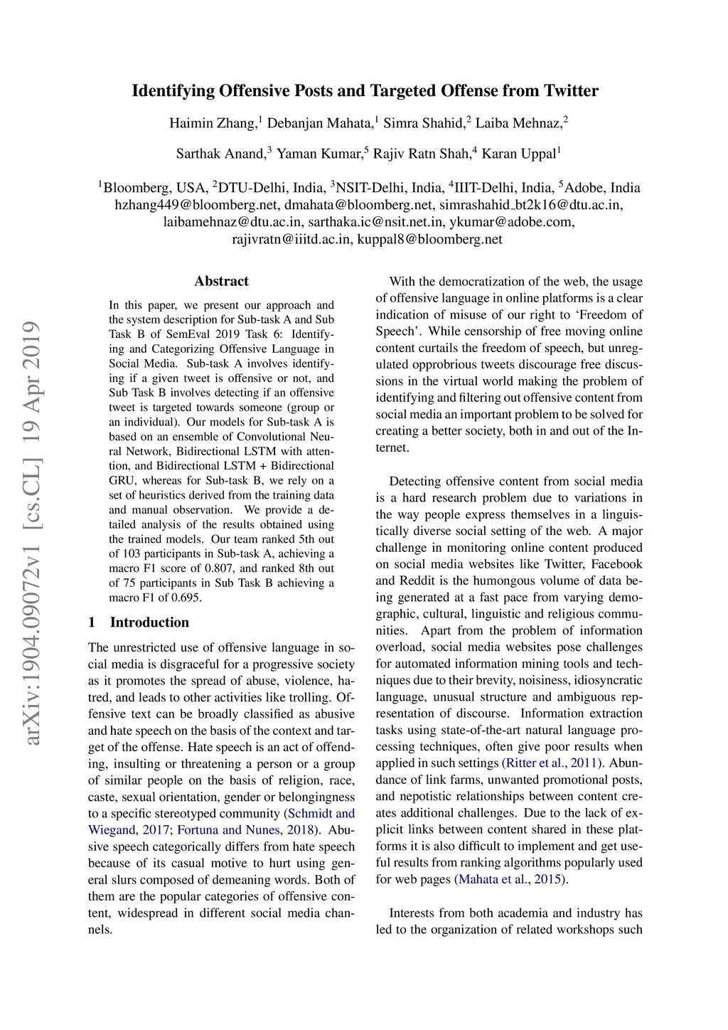 In this paper we present our approach and the system description for Sub-task A and Sub Task B of SemEval 2019 Task 6: Identifying and Categorizing Offensive Language in Social Media. Sub-task A involves identifying if a given tweet is offensive or not, and Sub Task B involves detecting if an offensive tweet is targeted towards someone (group or an individual). Our models for Sub-task A is based on an ensemble of Convolutional Neural Network, Bidirectional LSTM with attention, and Bidirectional LSTM + Bidirectional GRU, whereas for Sub-task B, we rely on a set of heuristics derived from the training data and manual observation. We provide detailed analysis of the results obtained using the trained models. Our team ranked 5th out of 103 participants in Sub-task A, achieving a macro F1 score of 0.807, and ranked 8th out of 75 participants in Sub Task B achieving a macro F1 of 0.695.