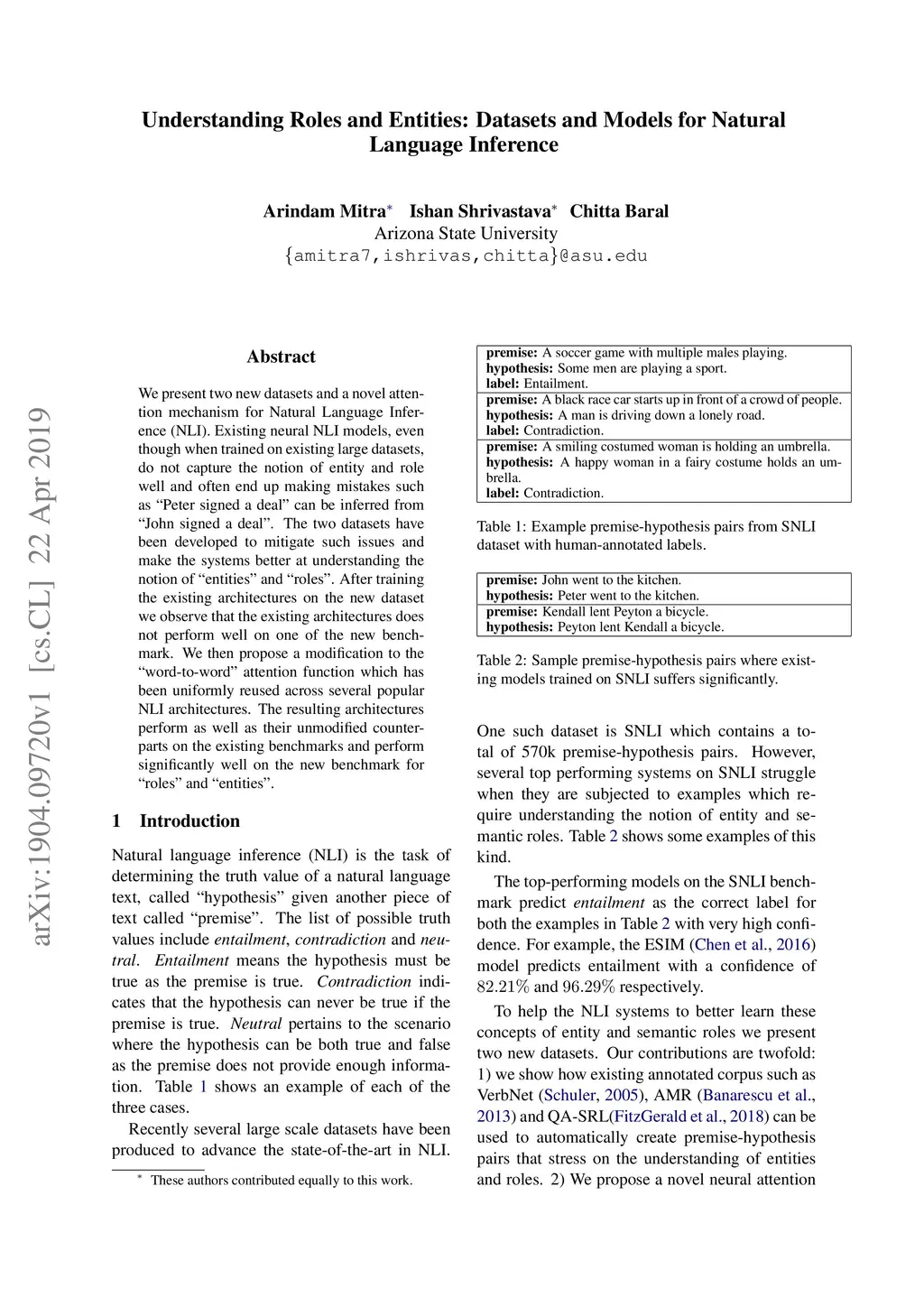 We present two new datasets and a novel attention mechanism for Natural Language Inference (NLI). Existing neural NLI models, even though when trained on existing large datasets, do not capture the notion of entity and role well and often end up making mistakes such as "Peter signed a deal" can be inferred from "John signed a deal". The two datasets have been developed to mitigate such issues and make the systems better at understanding the notion of "entities" and "roles". After training the existing architectures on the new dataset we observe that the existing architectures does not perform well on one of the new benchmark. We then propose a modification to the "word-to-word" attention function which has been uniformly reused across several popular NLI architectures. The resulting architectures perform as well as their unmodified counterparts on the existing benchmarks and perform significantly well on the new benchmark for "roles" and "entities".
