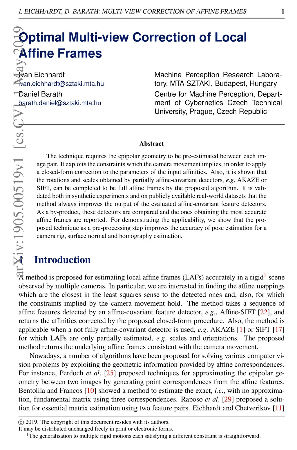 The technique requires the epipolar geometry to be pre-estimated between each image pair. It exploits the constraints which the camera movement implies, in order to apply a closed-form correction to the parameters of the input affinities. Also, it is shown that the rotations and scales obtained by partially affine-covariant detectors, e.g., AKAZE or SIFT, can be completed to be full affine frames by the proposed algorithm. It is validated both in synthetic experiments and on publicly available real-world datasets that the method always improves the output of the evaluated affine-covariant feature detectors. As a by-product, these detectors are compared and the ones obtaining the most accurate affine frames are reported. For demonstrating the applicability, we show that the proposed technique as a pre-processing step improves the accuracy of pose estimation for a camera rig, surface normal and homography estimation.