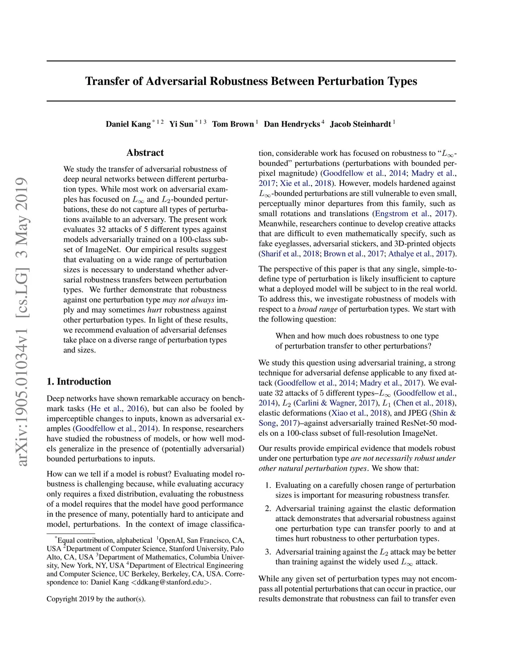 We study the transfer of adversarial robustness of deep neural networks between different perturbation types. While most work on adversarial examples has focused on and -bounded perturbations, these do not capture all types of perturbations available to an adversary. The present work evaluates 32 attacks of 5 different types against models adversarially trained on a 100-class subset of ImageNet. Our empirical results suggest that evaluating on a wide range of perturbation sizes is necessary to understand whether adversarial robustness transfers between perturbation types. We further demonstrate that robustness against one perturbation type may not always imply and may sometimes hurt robustness against other perturbation types. In light of these results, we recommend evaluation of adversarial defenses take place on a diverse range of perturbation types and sizes.