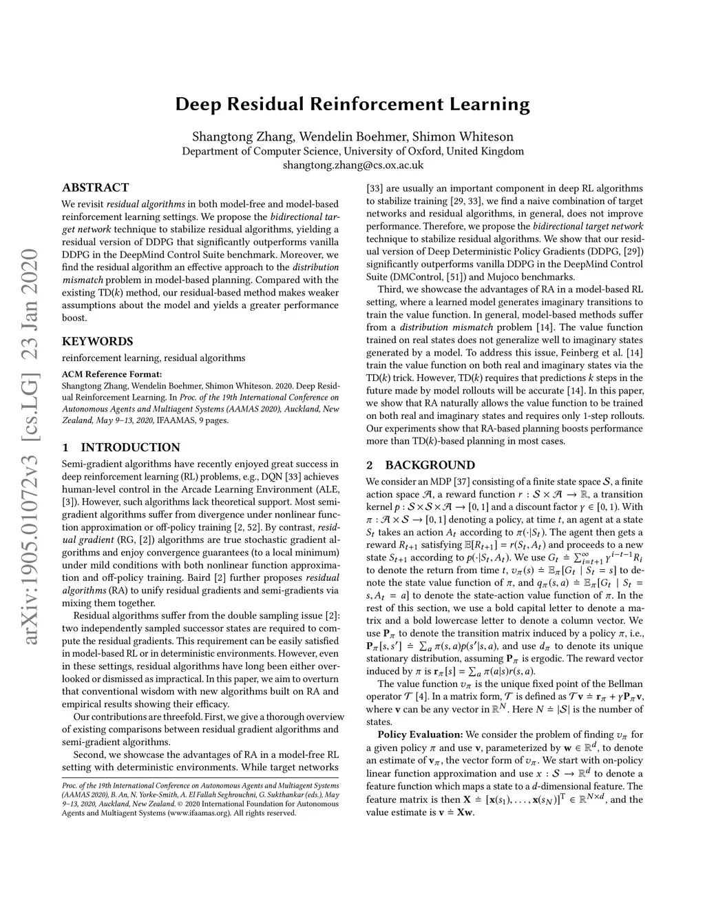 We revisit residual algorithms in both model-free and model-based reinforcement learning settings. We propose the bidirectional target network technique to stabilize residual algorithms, yielding a residual version of DDPG that significantly outperforms vanilla DDPG in the DeepMind Control Suite benchmark. Moreover, we find the residual algorithm an effective approach to the distribution mismatch problem in model-based planning. Compared with the existing TD() method, our residual-based method makes weaker assumptions about the model and yields a greater performance boost.