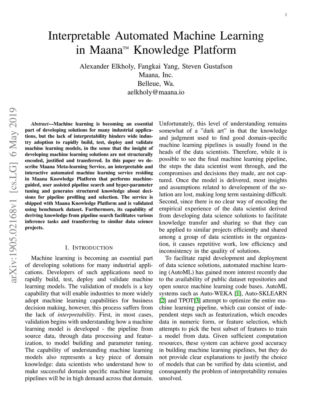 Interpretable Automated Machine Learning in Maana(TM) Knowledge Platform