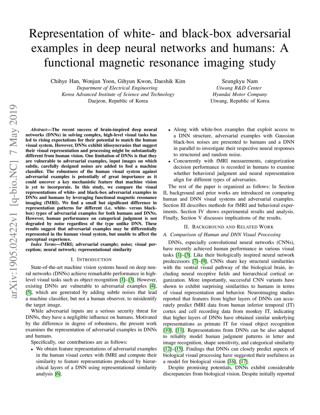 The recent success of brain-inspired deep neural networks (DNNs) in solving complex, high-level visual tasks has led to rising expectations for their potential to match the human visual system. However, DNNs exhibit idiosyncrasies that suggest their visual representation and processing might be substantially different from human vision. One limitation of DNNs is that they are vulnerable to adversarial examples, input images on which subtle, carefully designed noises are added to fool a machine classifier. The robustness of the human visual system against adversarial examples is potentially of great importance as it could uncover a key mechanistic feature that machine vision is yet to incorporate. In this study, we compare the visual representations of white- and black-box adversarial examples in DNNs and humans by leveraging functional magnetic resonance imaging (fMRI). We find a small but significant difference in representation patterns for different (i.e. white- versus black- box) types of adversarial examples for both humans and DNNs. However, human performance on categorical judgment is not degraded by noise regardless of the type unlike DNN. These results suggest that adversarial examples may be differentially represented in the human visual system, but unable to affect the perceptual experience.