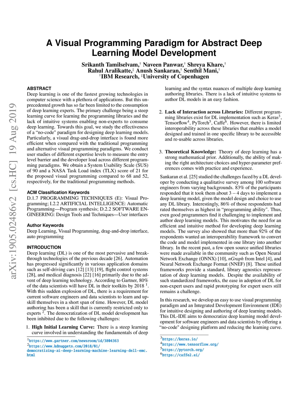 Deep learning is one of the fastest growing technologies in computer science with a plethora of applications. But this unprecedented growth has so far been limited to the consumption of deep learning experts. The primary challenge being a steep learning curve for learning the programming libraries and the lack of intuitive systems enabling non-experts to consume deep learning. Towards this goal, we study the effectiveness of a no-code paradigm for designing deep learning models. Particularly, a visual drag-and-drop interface is found more efficient when compared with the traditional programming and alternative visual programming paradigms. We conduct user studies of different expertise levels to measure the entry level barrier and the developer load across different programming paradigms. We obtain a System Usability Scale (SUS) of 90 and a NASA Task Load index (TLX) score of 21 for the proposed visual programming compared to 68 and 52, respectively, for the traditional programming methods.