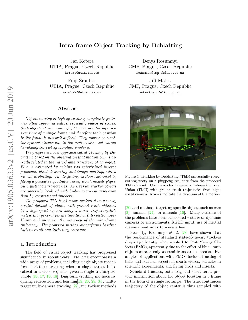 Objects moving at high speed along complex trajectories often appear in videos, especially videos of sports. Such objects elapse non-negligible distance during exposure time of a single frame and therefore their position in the frame is not well defined. They appear as semi-transparent streaks due to the motion blur and cannot be reliably tracked by standard trackers. We propose a novel approach called Tracking by Deblatting based on the observation that motion blur is directly related to the intra-frame trajectory of an object. Blur is estimated by solving two intertwined inverse problems, blind deblurring and image matting, which we call deblatting. The trajectory is then estimated by fitting a piecewise quadratic curve, which models physically justifiable trajectories. As a result, tracked objects are precisely localized with higher temporal resolution than by conventional trackers. The proposed TbD tracker was evaluated on a newly created dataset of videos with ground truth obtained by a high-speed camera using a novel Trajectory-IoU metric that generalizes the traditional Intersection over Union and measures the accuracy of the intra-frame trajectory. The proposed method outperforms baseline both in recall and trajectory accuracy.