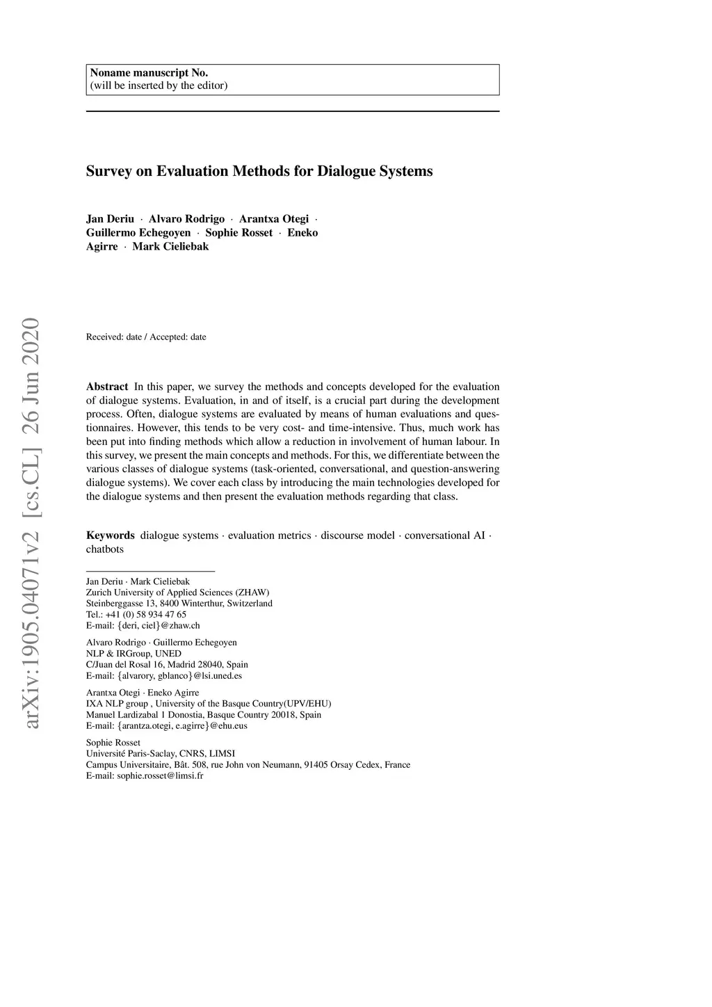 Survey on Evaluation Methods for Dialogue Systems