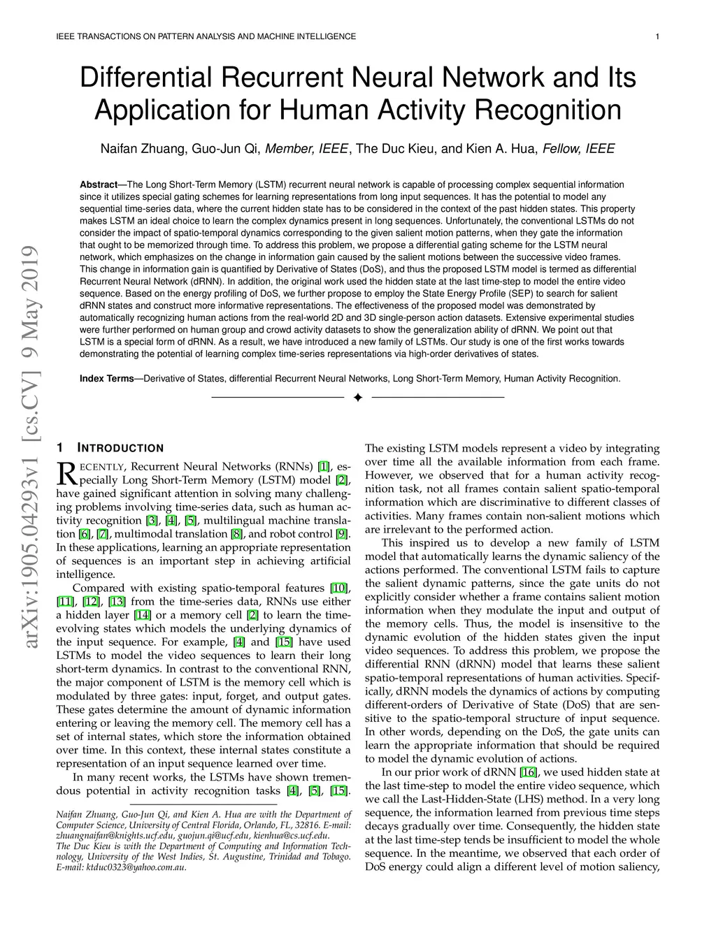 The Long Short-Term Memory (LSTM) recurrent neural network is capable of processing complex sequential information since it utilizes special gating schemes for learning representations from long input sequences. It has the potential to model any sequential time-series data, where the current hidden state has to be considered in the context of the past hidden states. This property makes LSTM an ideal choice to learn the complex dynamics present in long sequences. Unfortunately, the conventional LSTMs do not consider the impact of spatio-temporal dynamics corresponding to the given salient motion patterns, when they gate the information that ought to be memorized through time. To address this problem, we propose a differential gating scheme for the LSTM neural network, which emphasizes on the change in information gain caused by the salient motions between the successive video frames. This change in information gain is quantified by Derivative of States (DoS), and thus the proposed LSTM model is termed as differential Recurrent Neural Network (dRNN). In addition, the original work used the hidden state at the last time-step to model the entire video sequence. Based on the energy profiling of DoS, we further propose to employ the State Energy Profile (SEP) to search for salient dRNN states and construct more informative representations. The effectiveness of the proposed model was demonstrated by automatically recognizing human actions from the real-world 2D and 3D single-person action datasets. We point out that LSTM is a special form of dRNN. As a result, we have introduced a new family of LSTMs. Our study is one of the first works towards demonstrating the potential of learning complex time-series representations via high-order derivatives of states.