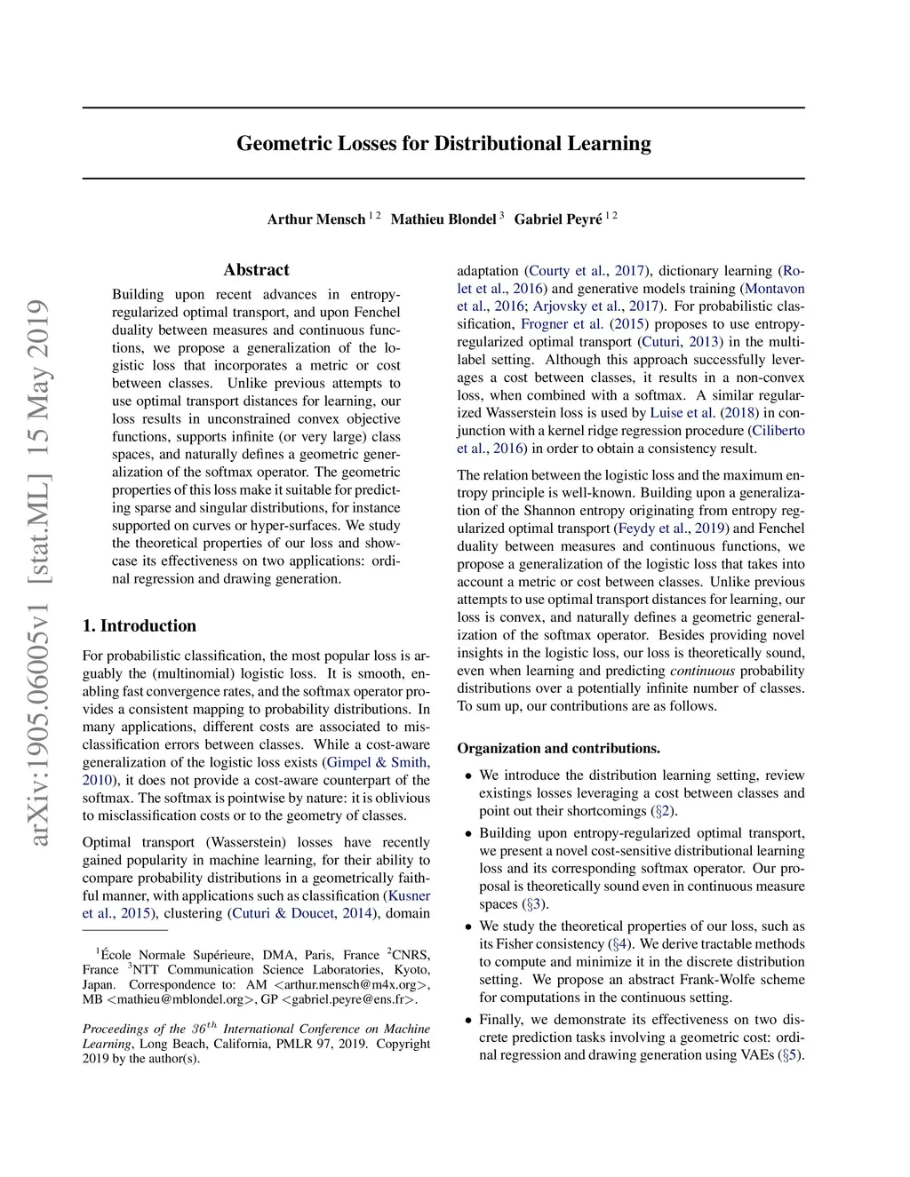 Building upon recent advances in entropy-regularized optimal transport, and upon Fenchel duality between measures and continuous functions , we propose a generalization of the logistic loss that incorporates a metric or cost between classes. Unlike previous attempts to use optimal transport distances for learning, our loss results in unconstrained convex objective functions, supports infinite (or very large) class spaces, and naturally defines a geometric generalization of the softmax operator. The geometric properties of this loss make it suitable for predicting sparse and singular distributions, for instance supported on curves or hyper-surfaces. We study the theoretical properties of our loss and show-case its effectiveness on two applications: ordinal regression and drawing generation.