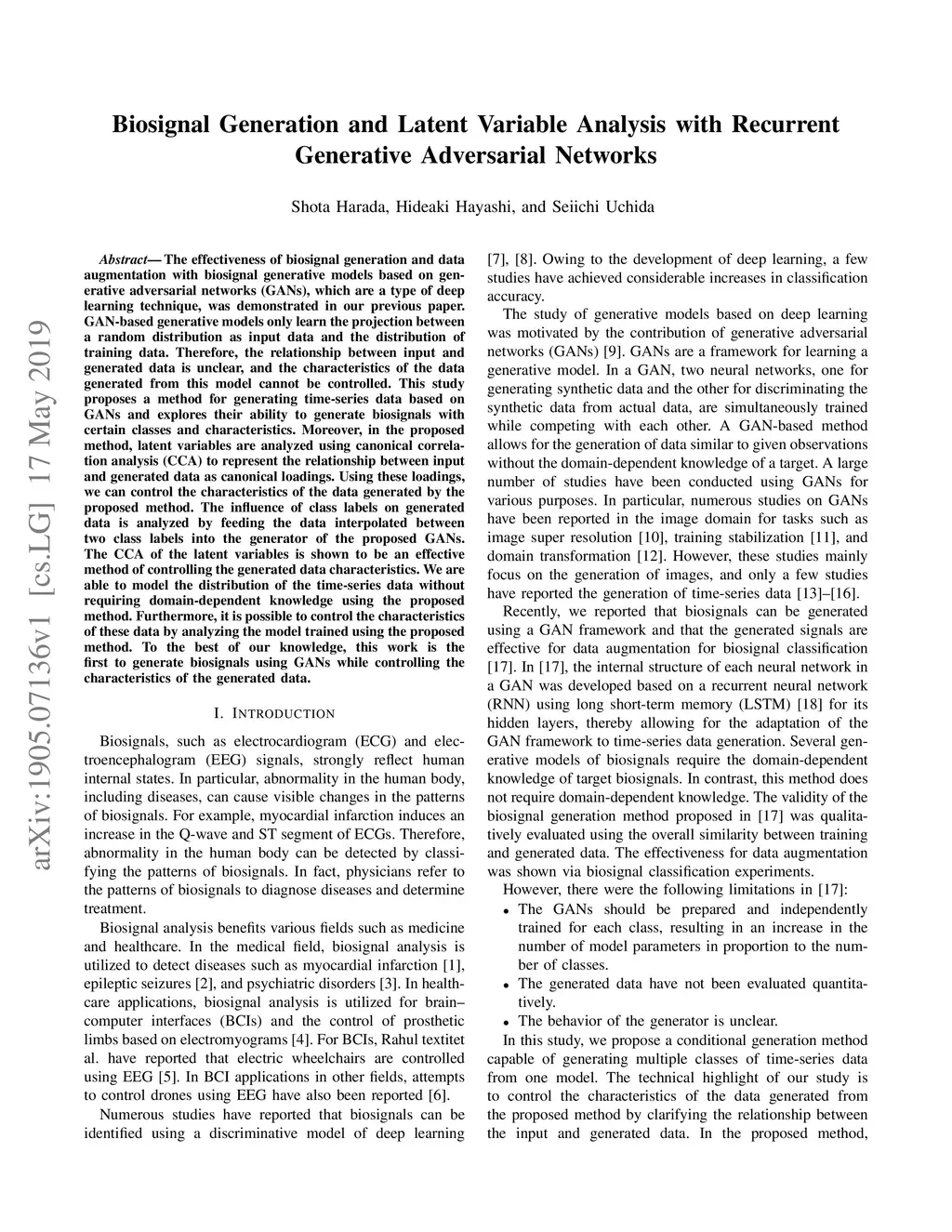The effectiveness of biosignal generation and data augmentation with biosignal generative models based on generative adversarial networks (GANs), which are a type of deep learning technique, was demonstrated in our previous paper. GAN-based generative models only learn the projection between a random distribution as input data and the distribution of training data.Therefore, the relationship between input and generated data is unclear, and the characteristics of the data generated from this model cannot be controlled. This study proposes a method for generating time-series data based on GANs and explores their ability to generate biosignals with certain classes and characteristics. Moreover, in the proposed method, latent variables are analyzed using canonical correlation analysis (CCA) to represent the relationship between input and generated data as canonical loadings. Using these loadings, we can control the characteristics of the data generated by the proposed method. The influence of class labels on generated data is analyzed by feeding the data interpolated between two class labels into the generator of the proposed GANs. The CCA of the latent variables is shown to be an effective method of controlling the generated data characteristics. We are able to model the distribution of the time-series data without requiring domain-dependent knowledge using the proposed method. Furthermore, it is possible to control the characteristics of these data by analyzing the model trained using the proposed method. To the best of our knowledge, this work is the first to generate biosignals using GANs while controlling the characteristics of the generated data.