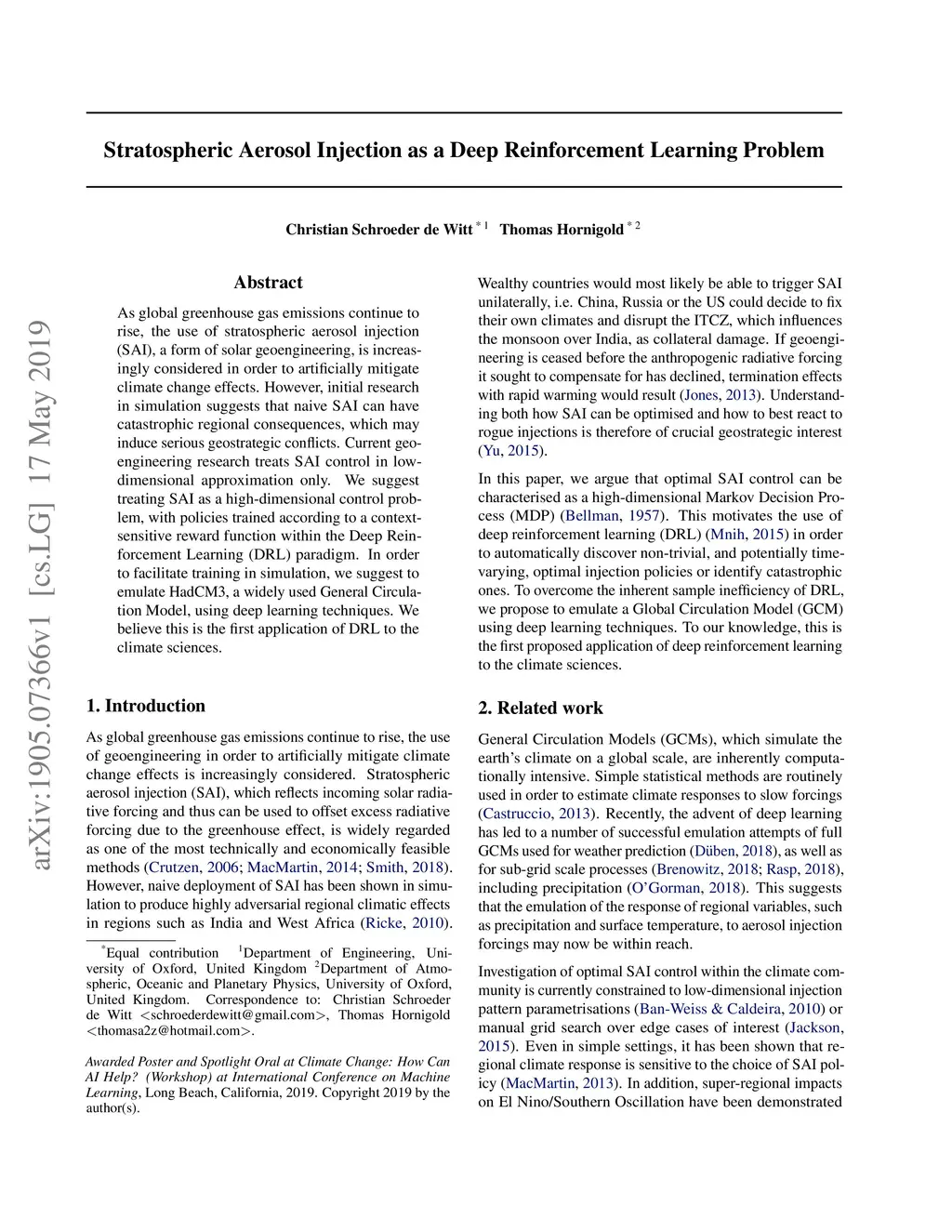 As global greenhouse gas emissions continue to rise, the use of stratospheric aerosol injection (SAI), a form of solar geoengineering, is increasingly considered in order to artificially mitigate climate change effects. However, initial research in simulation suggests that naive SAI can have catastrophic regional consequences, which may induce serious geostrategic conflicts. Current geo-engineering research treats SAI control in low-dimensional approximation only. We suggest treating SAI as a high-dimensional control problem, with policies trained according to a context-sensitive reward function within the Deep Reinforcement Learning (DRL) paradigm. In order to facilitate training in simulation, we suggest to emulate HadCM3, a widely used General Circulation Model, using deep learning techniques. We believe this is the first application of DRL to the climate sciences.