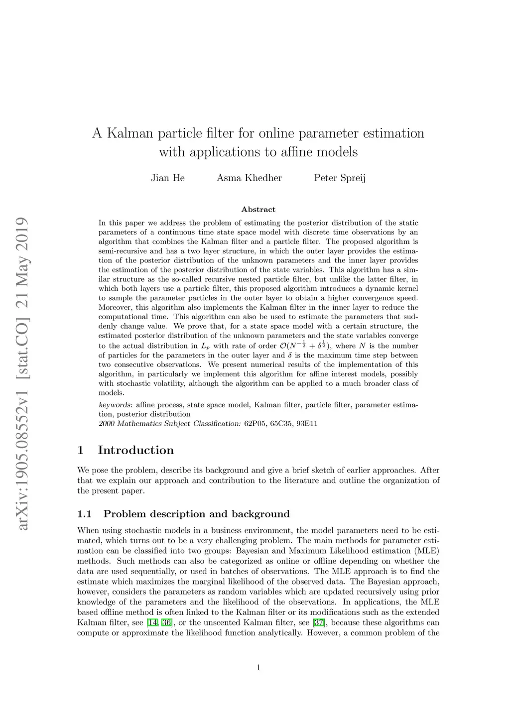 In this paper we address the problem of estimating the posterior distribution of the static parameters of a continuous time state space model with discrete time observations by an algorithm that combines the Kalman filter and a particle filter. The proposed algorithm is semi-recursive and has a two layer structure, in which the outer layer provides the estimation of the posterior distribution of the unknown parameters and the inner layer provides the estimation of the posterior distribution of the state variables. This algorithm has a similar structure as the so-called recursive nested particle filter, but unlike the latter filter, in which both layers use a particle filter, this proposed algorithm introduces a dynamic kernel to sample the parameter particles in the outer layer to obtain a higher convergence speed. Moreover, this algorithm also implements the Kalman filter in the inner layer to reduce the computational time. This algorithm can also be used to estimate the parameters that suddenly change value. We prove that, for a state space model with a certain structure, the estimated posterior distribution of the unknown parameters and the state variables converge to the actual distribution in with rate of order , where is the number of particles for the parameters in the outer layer and is the maximum time step between two consecutive observations. We present numerical results of the implementation of this algorithm, in particularly we implement this algorithm for affine interest models, possibly with stochastic volatility, although the algorithm can be applied to a much broader class of models.