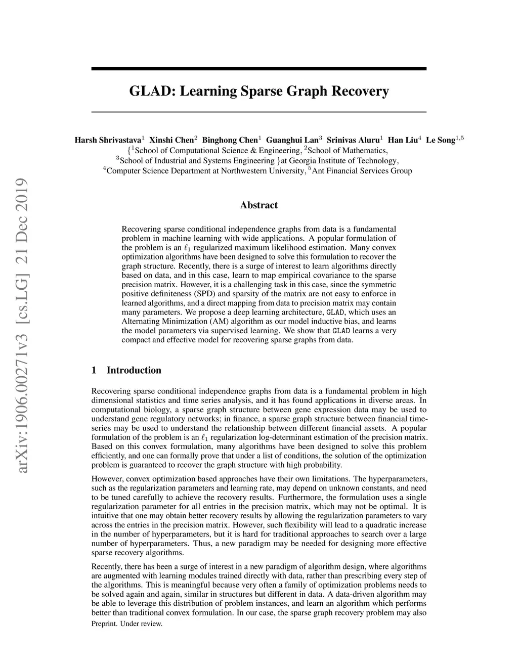 Recovering sparse conditional independence graphs from data is a fundamental problem in machine learning with wide applications. A popular formulation of the problem is an 1\ell_1 regularized maximum likelihood estimation. Many convex optimization algorithms have been designed to solve this formulation to recover the graph structure. Recently, there is a surge of interest to learn algorithms directly based on data, and in this case, learn to map empirical covariance to the sparse precision matrix. However, it is a challenging task in this case, since the symmetric positive definiteness (SPD) and sparsity of the matrix are not easy to enforce in learned algorithms, and a direct mapping from data to precision matrix may contain many parameters. We propose a deep learning architecture, GLAD, which uses an Alternating Minimization (AM) algorithm as our model inductive bias, and learns the model parameters via supervised learning. We show that GLAD learns a very compact and effective model for recovering sparse graphs from data.