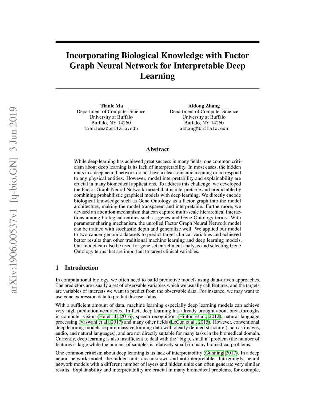 While deep learning has achieved great success in many fields, one common criticism about deep learning is its lack of interpretability. In most cases, the hidden units in a deep neural network do not have a clear semantic meaning or correspond to any physical entities. However, model interpretability and explainability are crucial in many biomedical applications. To address this challenge, we developed the Factor Graph Neural Network model that is interpretable and predictable by combining probabilistic graphical models with deep learning. We directly encode biological knowledge such as Gene Ontology as a factor graph into the model architecture, making the model transparent and interpretable. Furthermore, we devised an attention mechanism that can capture multi-scale hierarchical interactions among biological entities such as genes and Gene Ontology terms. With parameter sharing mechanism, the unrolled Factor Graph Neural Network model can be trained with stochastic depth and generalize well. We applied our model to two cancer genomic datasets to predict target clinical variables and achieved better results than other traditional machine learning and deep learning models. Our model can also be used for gene set enrichment analysis and selecting Gene Ontology terms that are important to target clinical variables.