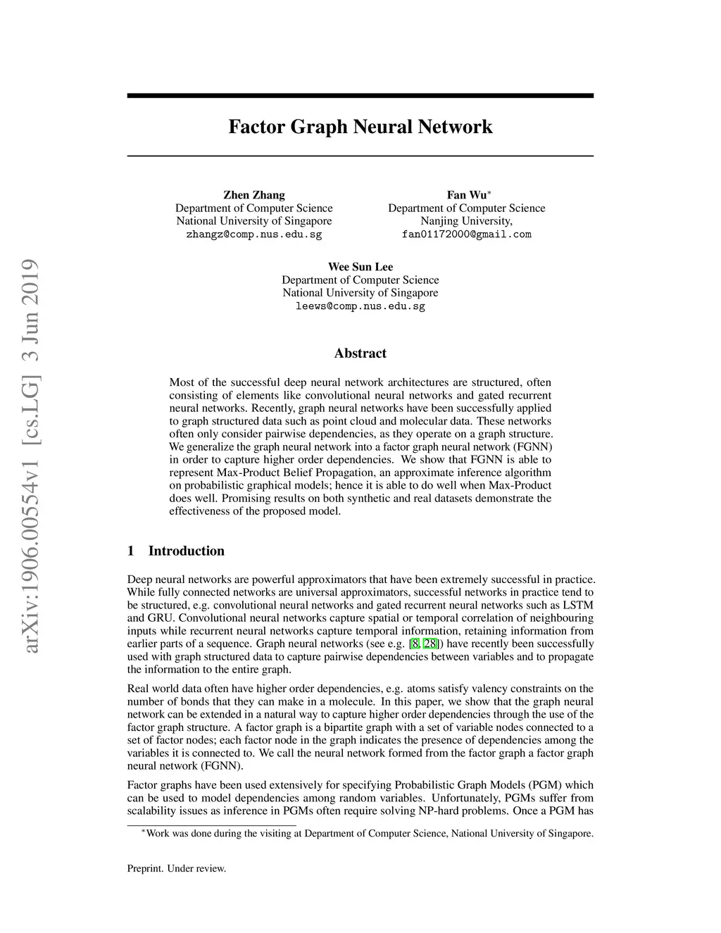Most of the successful deep neural network architectures are structured, often consisting of elements like convolutional neural networks and gated recurrent neural networks. Recently, graph neural networks have been successfully applied to graph structured data such as point cloud and molecular data. These networks often only consider pairwise dependencies, as they operate on a graph structure. We generalize the graph neural network into a factor graph neural network (FGNN) in order to capture higher order dependencies. We show that FGNN is able to represent Max-Product Belief Propagation, an approximate inference algorithm on probabilistic graphical models; hence it is able to do well when Max-Product does well. Promising results on both synthetic and real datasets demonstrate the effectiveness of the proposed model.