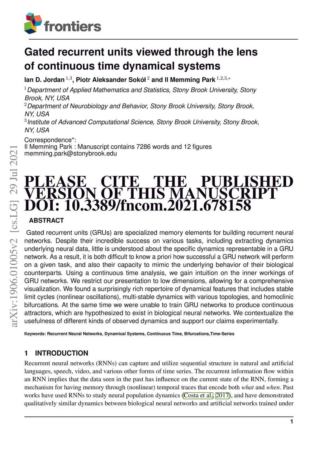 Gated recurrent units (GRUs) are specialized memory elements for building recurrent neural networks. Despite their incredible success on various tasks, including extracting dynamics underlying neural data, little is understood about the specific dynamics representable in a GRU network. As a result, it is both difficult to know a priori how successful a GRU network will perform on a given task, and also their capacity to mimic the underlying behavior of their biological counterparts. Using a continuous time analysis, we gain intuition on the inner workings of GRU networks. We restrict our presentation to low dimensions, allowing for a comprehensive visualization. We found a surprisingly rich repertoire of dynamical features that includes stable limit cycles (nonlinear oscillations), multi-stable dynamics with various topologies, and homoclinic bifurcations. At the same time we were unable to train GRU networks to produce continuous attractors, which are hypothesized to exist in biological neural networks. We contextualize the usefulness of different kinds of observed dynamics and support our claims experimentally.