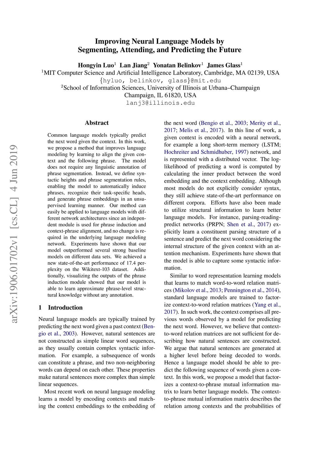 Common language models typically predict the next word given the context. In this work, we propose a method that improves language modeling by learning to align the given context and the following phrase. The model does not require any linguistic annotation of phrase segmentation. Instead, we define syntactic heights and phrase segmentation rules, enabling the model to automatically induce phrases, recognize their task-specific heads, and generate phrase embeddings in an unsupervised learning manner. Our method can easily be applied to language models with different network architectures since an independent module is used for phrase induction and context-phrase alignment, and no change is required in the underlying language modeling network. Experiments have shown that our model outperformed several strong baseline models on different data sets. We achieved a new state-of-the-art performance of 17.4 perplexity on the Wikitext-103 dataset. Additionally, visualizing the outputs of the phrase induction module showed that our model is able to learn approximate phrase-level structural knowledge without any annotation.