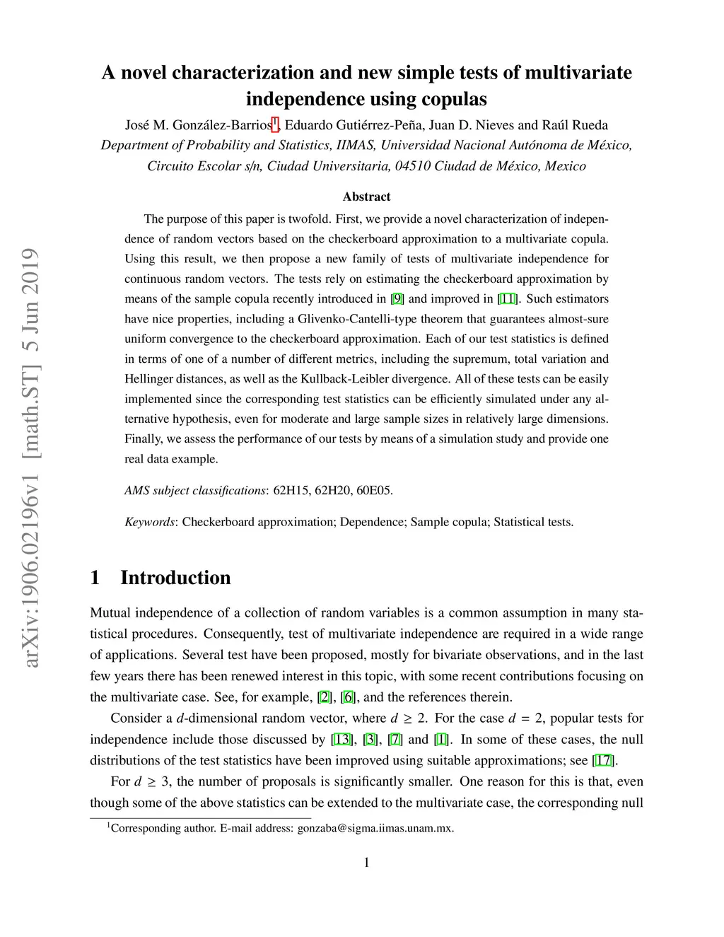 The purpose of this paper is twofold. First, we provide a novel characterization of independence of random vectors based on the checkerboard approximation to a multivariate copula. Using this result, we then propose a new family of tests of multivariate independence for continuous random vectors. The tests rely on estimating the checkerboard approximation by means of the sample copula recently introduced in [9] and improved in [11]. Such estimators have nice properties, including a Glivenko-Cantelli-type theorem that guarantees almost-sure uniform convergence to the checkerboard approximation. Each of our test statistics is defined in terms of one of a number of different metrics, including the supremum, total variation and Hellinger distances, as well as the Kullback-Leibler divergence. All of these tests can be easily implemented since the corresponding test statistics can be efficiently simulated under any alternative hypothesis, even for moderate and large sample sizes in relatively large dimensions. Finally, we assess the performance of our tests by means of a simulation study and provide one real data example.