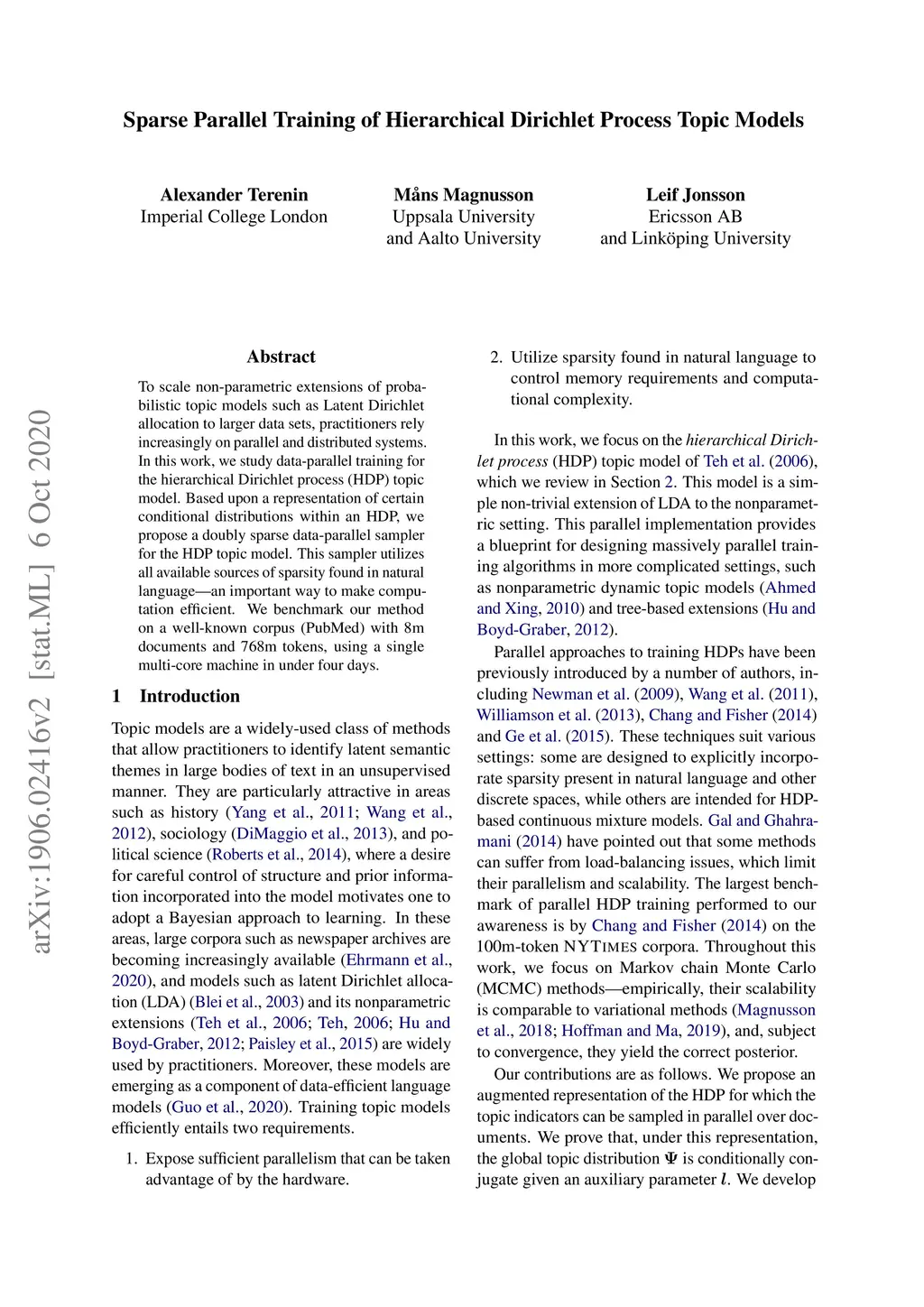 Sparse Parallel Training of Hierarchical Dirichlet Process Topic Models