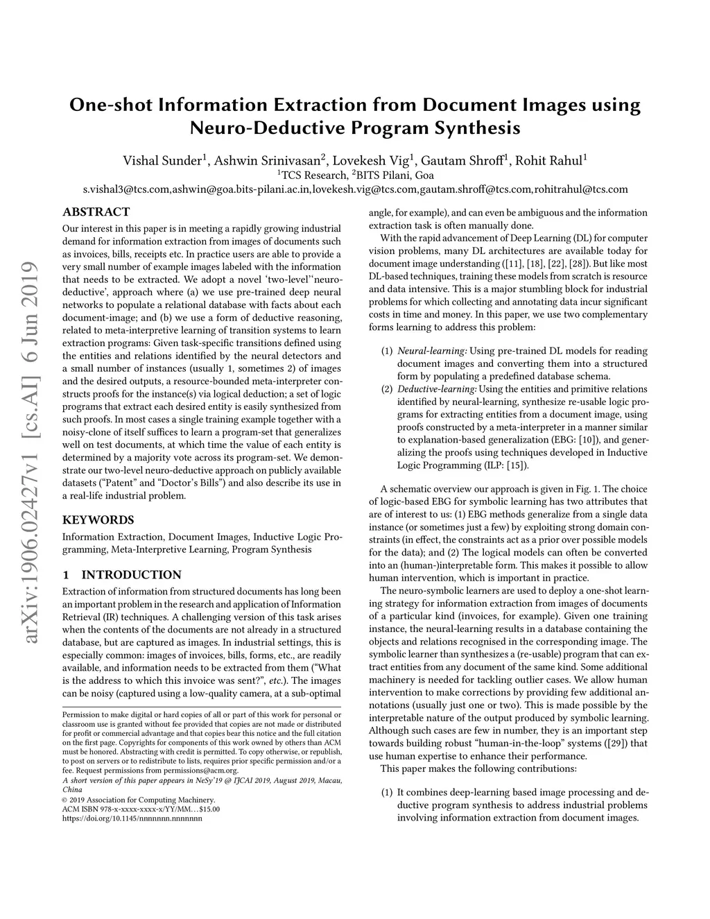 Our interest in this paper is in meeting a rapidly growing industrial demand for information extraction from images of documents such as invoices, bills, receipts etc. In practice users are able to provide a very small number of example images labeled with the information that needs to be extracted. We adopt a novel two-level neuro-deductive, approach where (a) we use pre-trained deep neural networks to populate a relational database with facts about each document-image; and (b) we use a form of deductive reasoning, related to meta-interpretive learning of transition systems to learn extraction programs: Given task-specific transitions defined using the entities and relations identified by the neural detectors and a small number of instances (usually 1, sometimes 2) of images and the desired outputs, a resource-bounded meta-interpreter constructs proofs for the instance(s) via logical deduction; a set of logic programs that extract each desired entity is easily synthesized from such proofs. In most cases a single training example together with a noisy-clone of itself suffices to learn a program-set that generalizes well on test documents, at which time the value of each entity is determined by a majority vote across its program-set. We demonstrate our two-level neuro-deductive approach on publicly available datasets ("Patent" and "Doctor's Bills") and also describe its use in a real-life industrial problem.